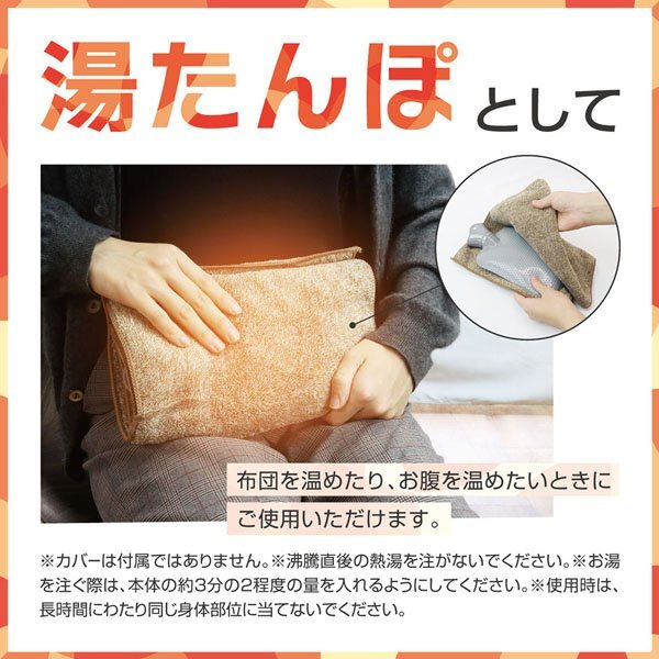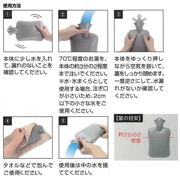 ※ 沸騰直後の熱湯を注がないでください。 ※ お湯を注ぐ際は、本体の約3分の2程度の量を入れるようにしてください。 ※ 使用時は、長時間にわたり同じ身体部位に当てないでください。 ※ カバーは付属しません。 ※ 氷まくらとして使用する場合、注ぎ口が小さいため、2cm以下の小さな氷をご使用ください。 ・ 掲載画像はイメージであり、実際の製品とは多少異なる場合があります。 ・ パッケージや個装形態は入荷時期によって変更となる場合があります。 ・ 製品の仕様は品質の向上・改善のため、予告なく変更となる場合があります。 | ||||||||||||||||||
