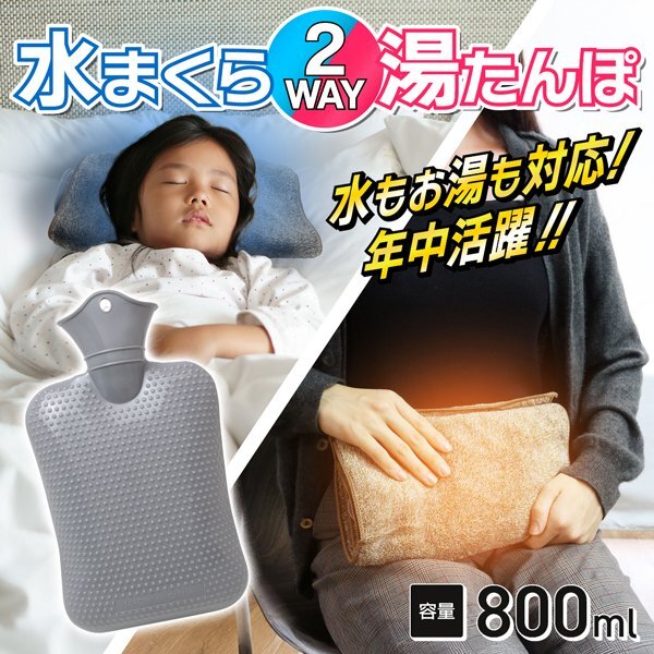 | 水まくら/湯たんぽの2WAYで使える! 1つでオールシーズン大活躍! 湯たんぽと水まくら、両方の用途で使える便利なアイテム! ■ 容量800ml ■ 100度 ■ 0度 ★ 湯たんぽとして 布団を温めたり、お腹を温めたいときにご使用いただけます。 ※ カバーは付属しません。 ★ 水まくらとして 夏の暑さ対策や熱冷ましにご使用いただけます。 ※ カバーは付属しません。 コンパクトながらも大容量! オールシーズンあらゆるシーンで活躍します♪