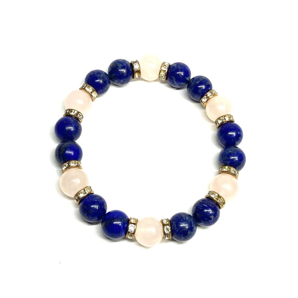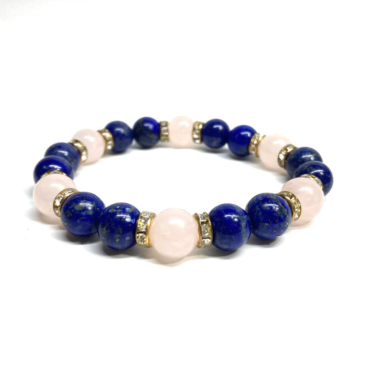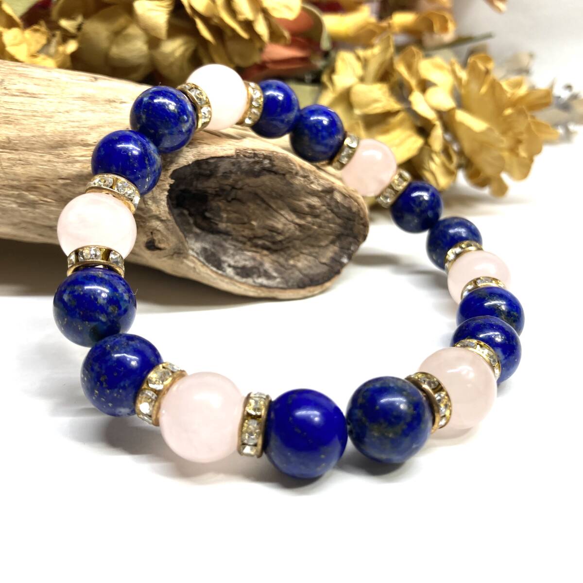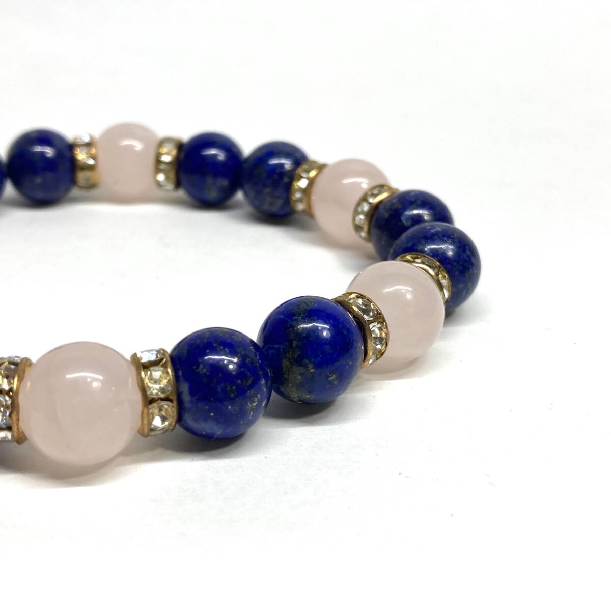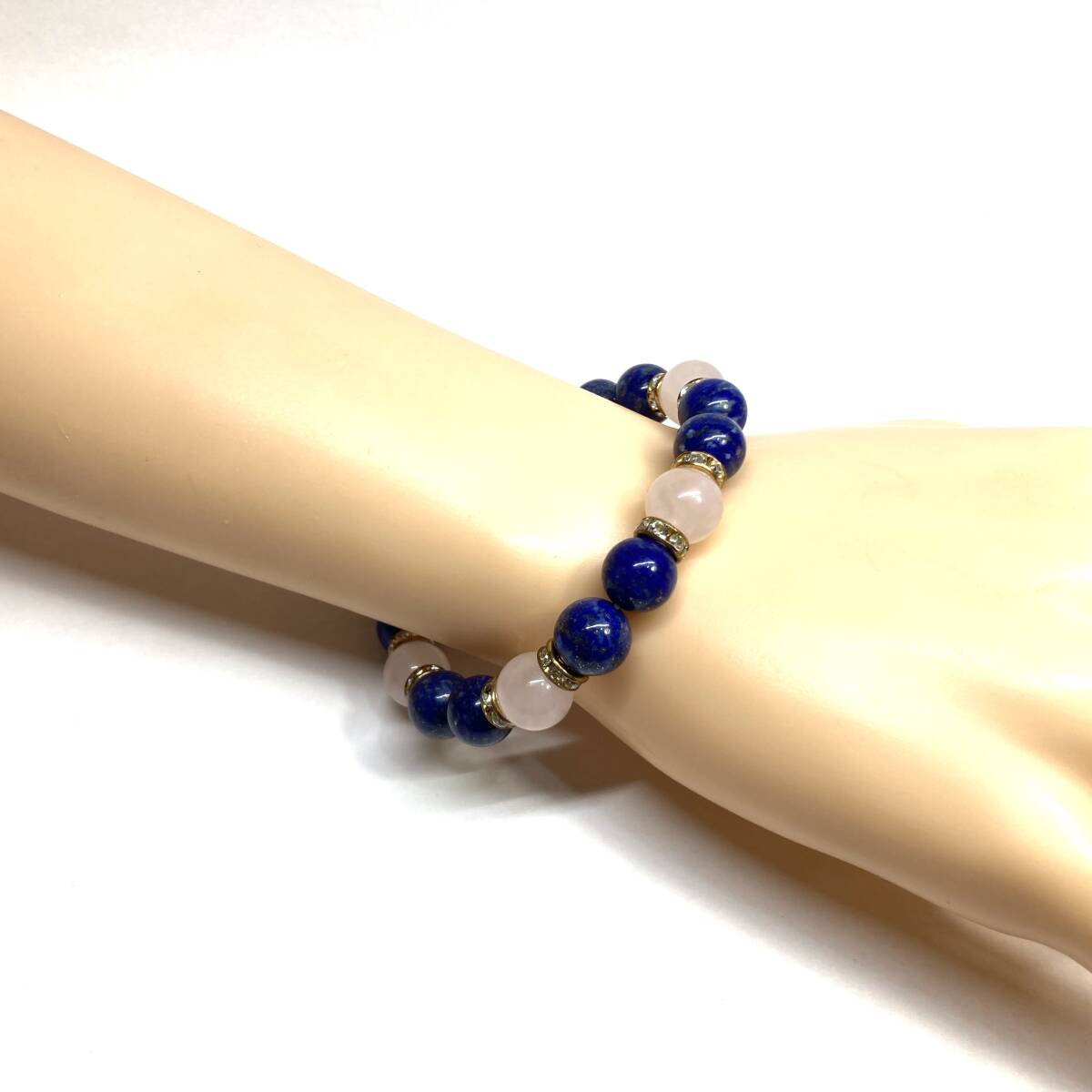 こちらは、ラピスラズリとローズクォーツを組み合わせたパワーストーンブレスレットです。間にはロンデルを挟み高級感あるデザインに仕上げております。石大きさは腕にも馴染みやすいように10mm玉で内径約18cm(伸可能)です。(サイズ変更の場合は取引ナビにてご連絡をお願いします。) 数に限りがございますので気になる方はお早めにどうぞ。