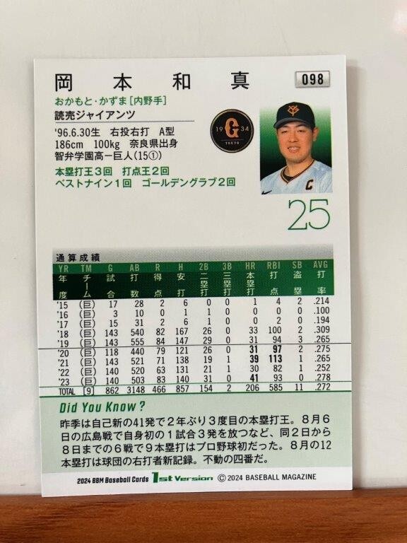 【2024 BBM 1st】098岡本和真(読売ジャイアンツ)レギュラーカード※キラカード版