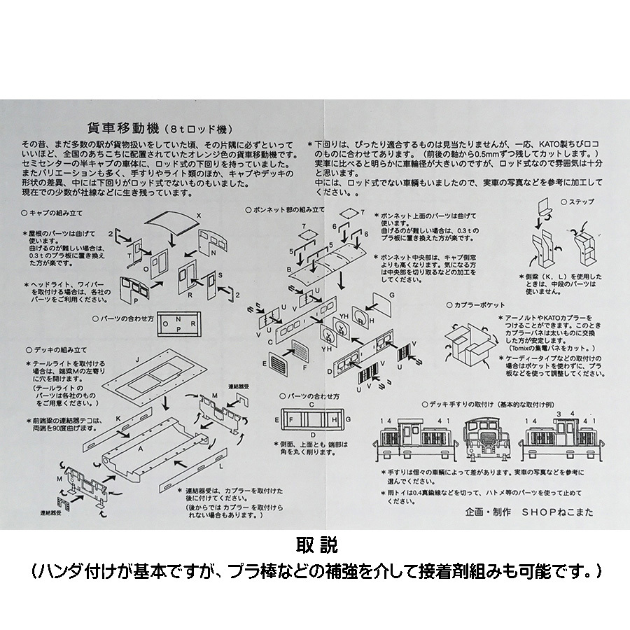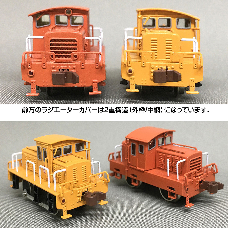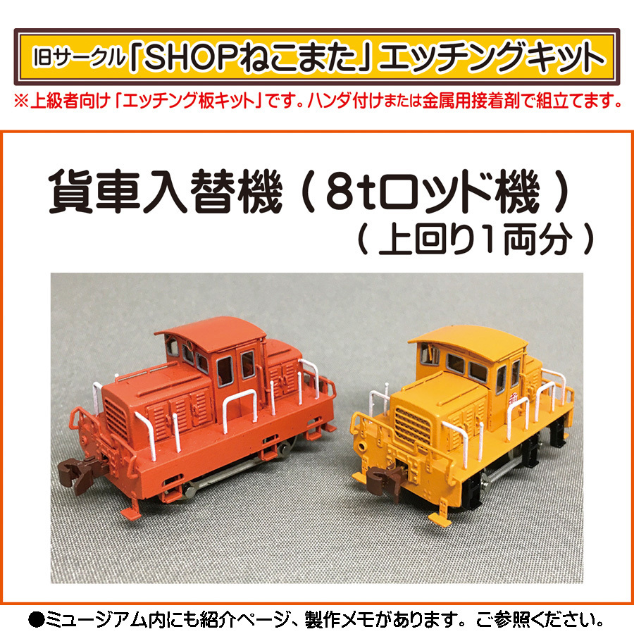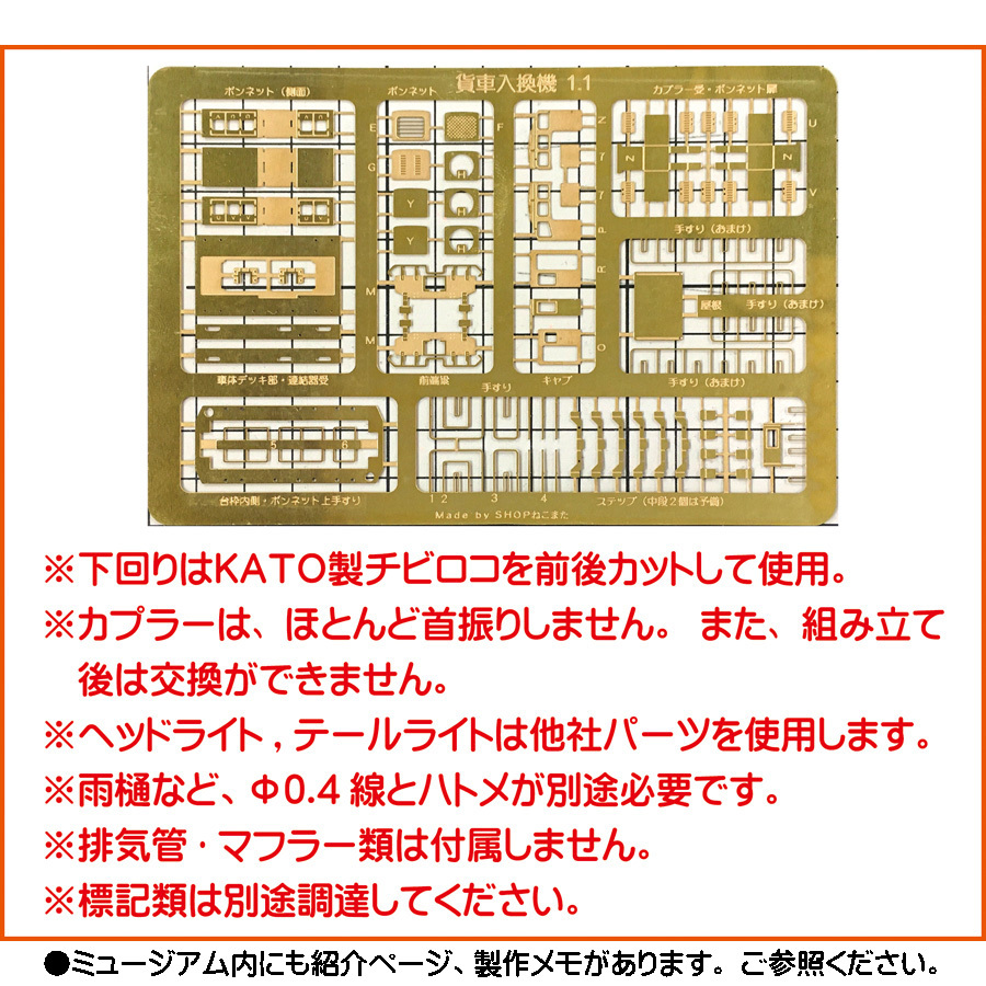 上級者向け:「エッチング製キット」です。 基本はハンダ付けで組み立てますが、プラ棒などを補強に利用することで、接着剤で組み立てることも可能です。 国鉄時代には、荷扱いのある各駅で見られた、半キャブ式の小型スイッチャーです。 上回りのみのキットで、下回りはKATOチビロコを使用します。 動力化には対応しません。 ※ロッド可動式に組み上がりますが、車輪径は実車よりオーバースケールになります。