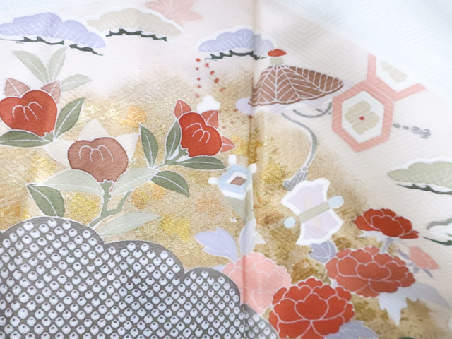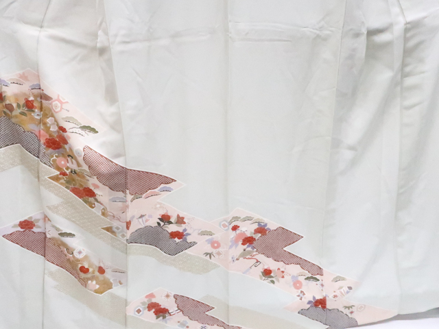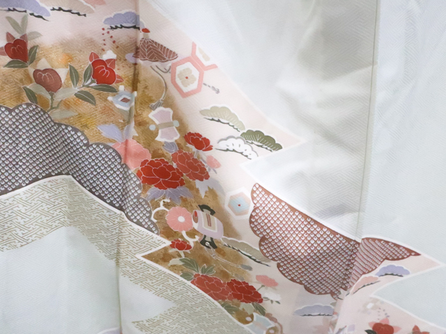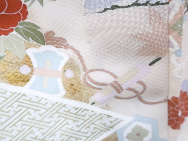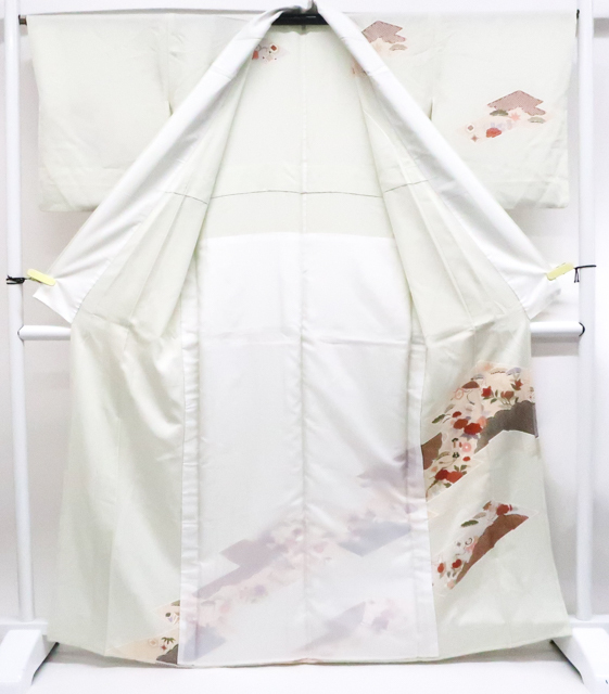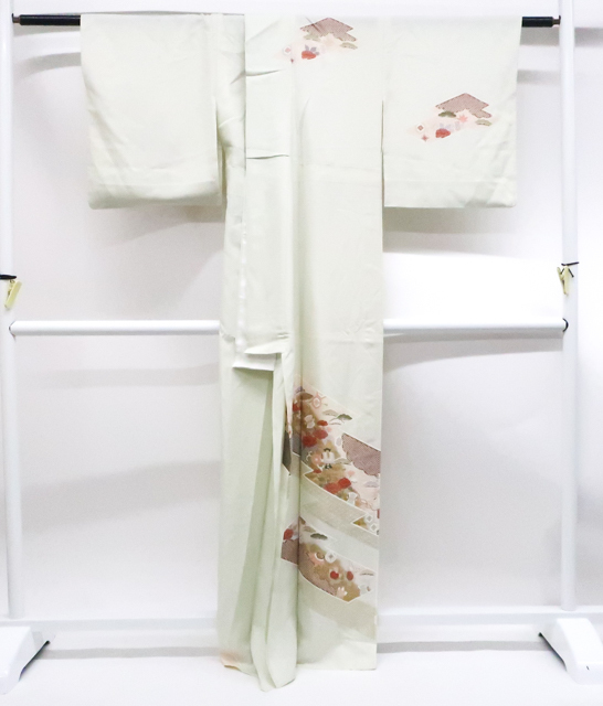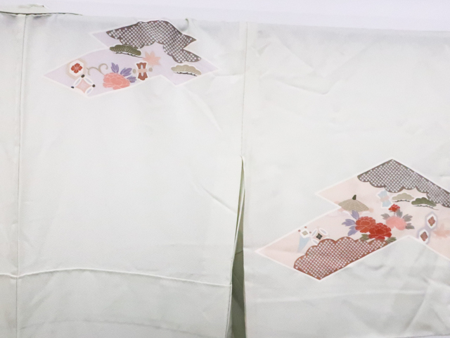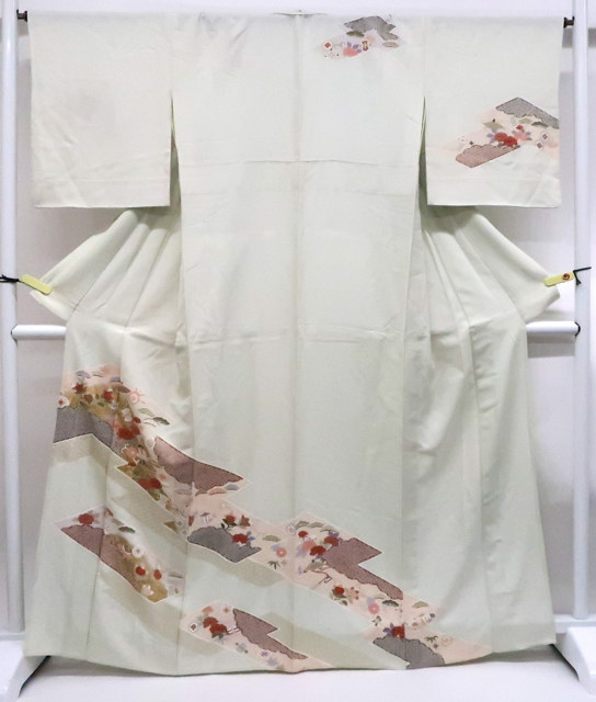 リサイクル商品のため、上衽薄汚れがございます。 所々点シミ・薄ヤケ・しわがございますが着用可能なお品です。 地色は白緑です。 1枚目の画像が近いお色かと思われます。 素材は正絹です。 |