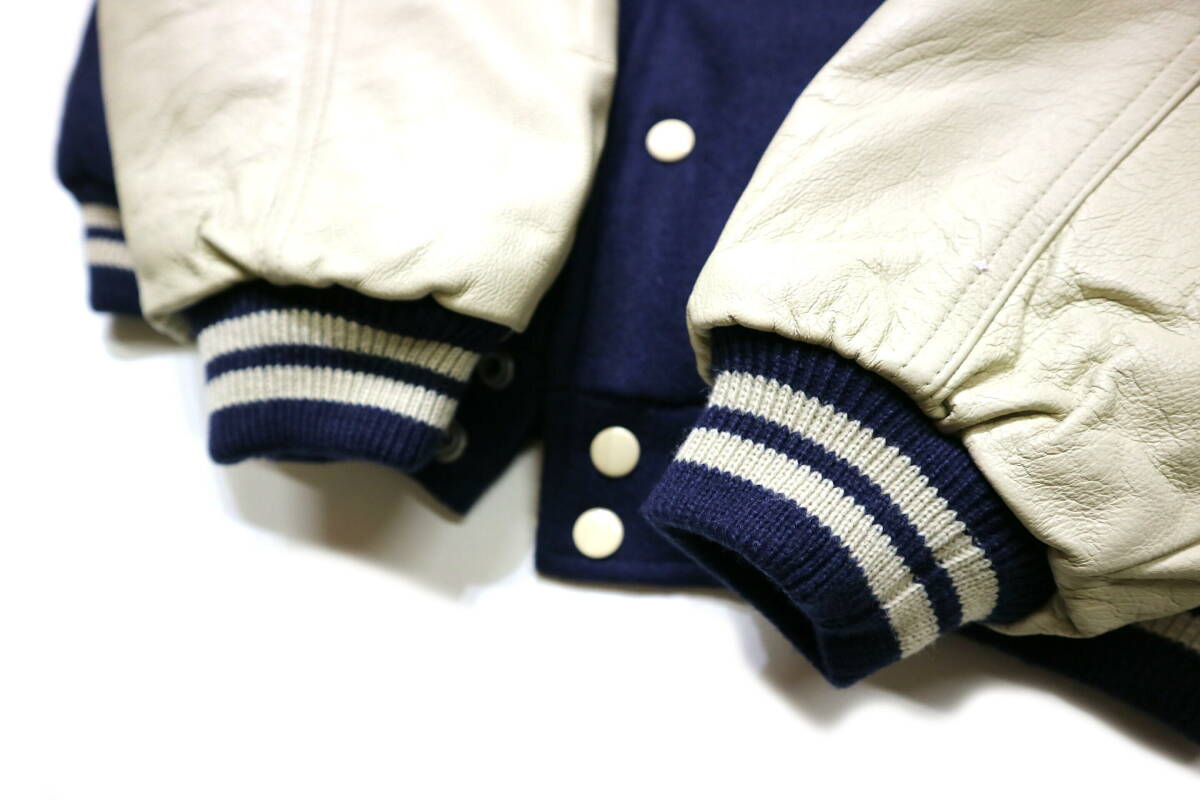 ・袖は牛革で安心の作りです。スタジャンとしての作りは中厚~気持ち厚手、晩秋から冬、春先までと長く着用頂けます。内ポケットは左胸の内側に1つ、肩はパッドなしです。