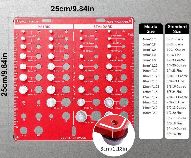 手元にあるボルトやナットのサイズが分からず困った経験はありませんか?この「ねじチェッカー」があれば、ミリねじ14種類、インチねじ(UNC/UNF)14種類の合計28種類のねじ径とピッチを簡単かつ正確に識別できます。ボルトは対応するねじ穴に、ナットは対応するねじ山に合わせるだけでOKです。プレートの両サイドには15cmと6インチの定規も付いており、ねじの長さも同時に測定可能です。丈夫な金属製で、DIY愛好家からプロの整備士まで幅広くお使いいただけます。作業効率アップ、部品の誤購入防止に役立つ必須ツールです。