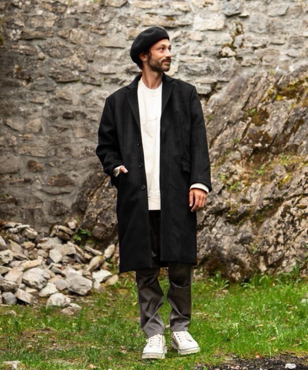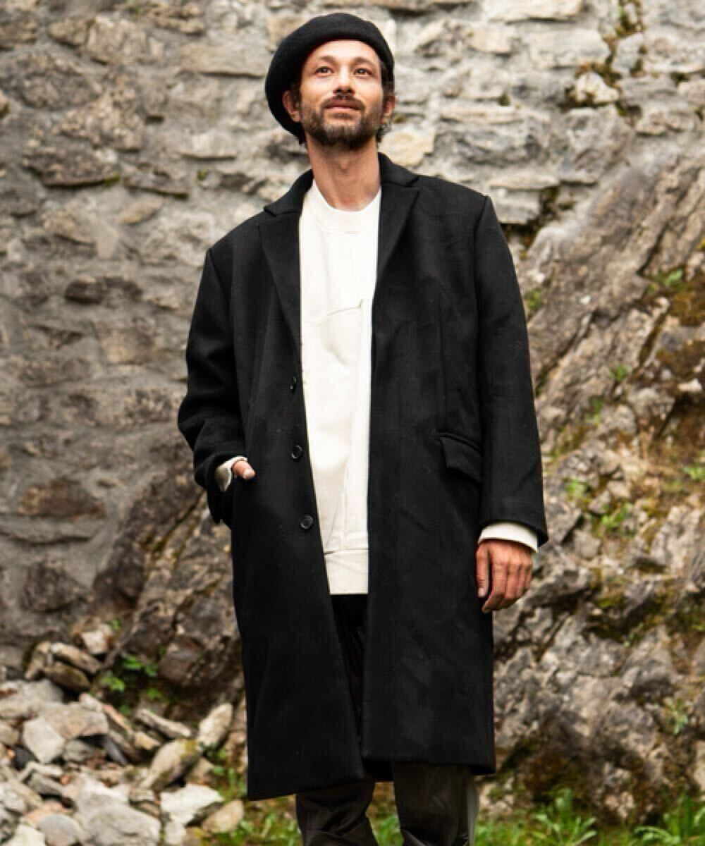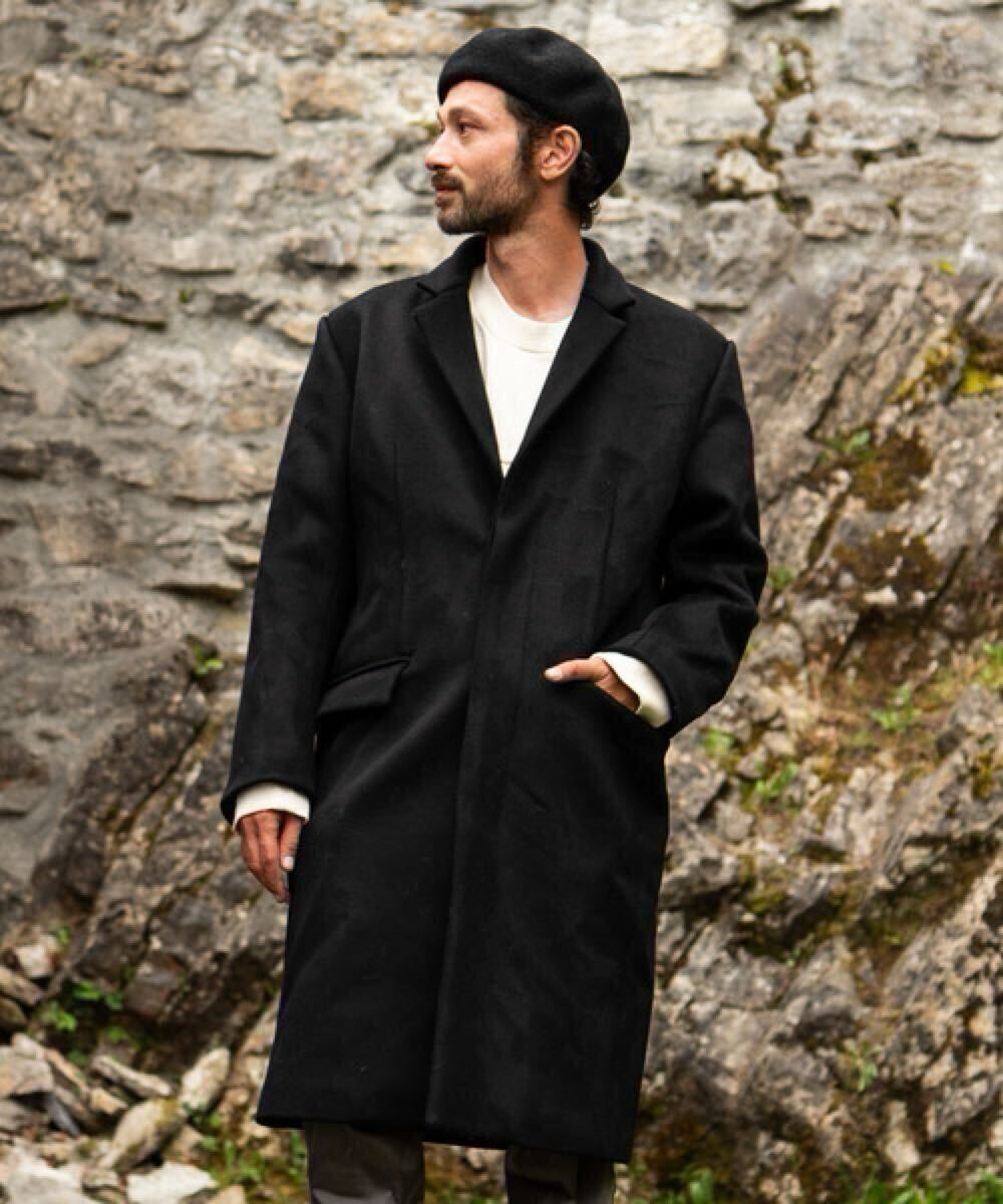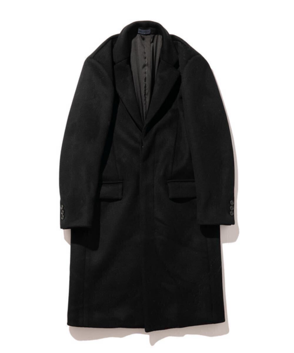カシミヤタッチの厚いメルトンで仕立てたのは、両サイドにフラップポケットを配したのみの端正な1着。