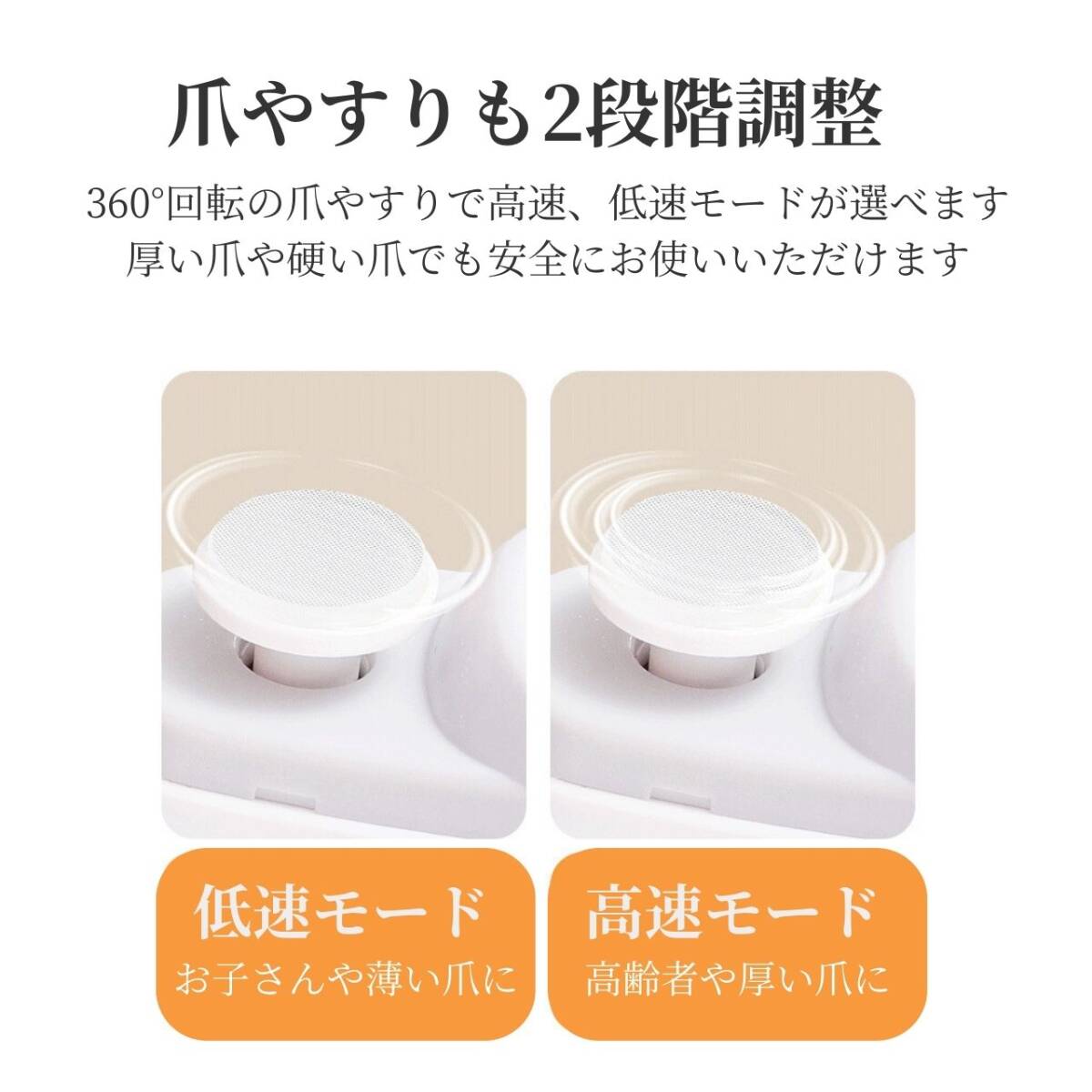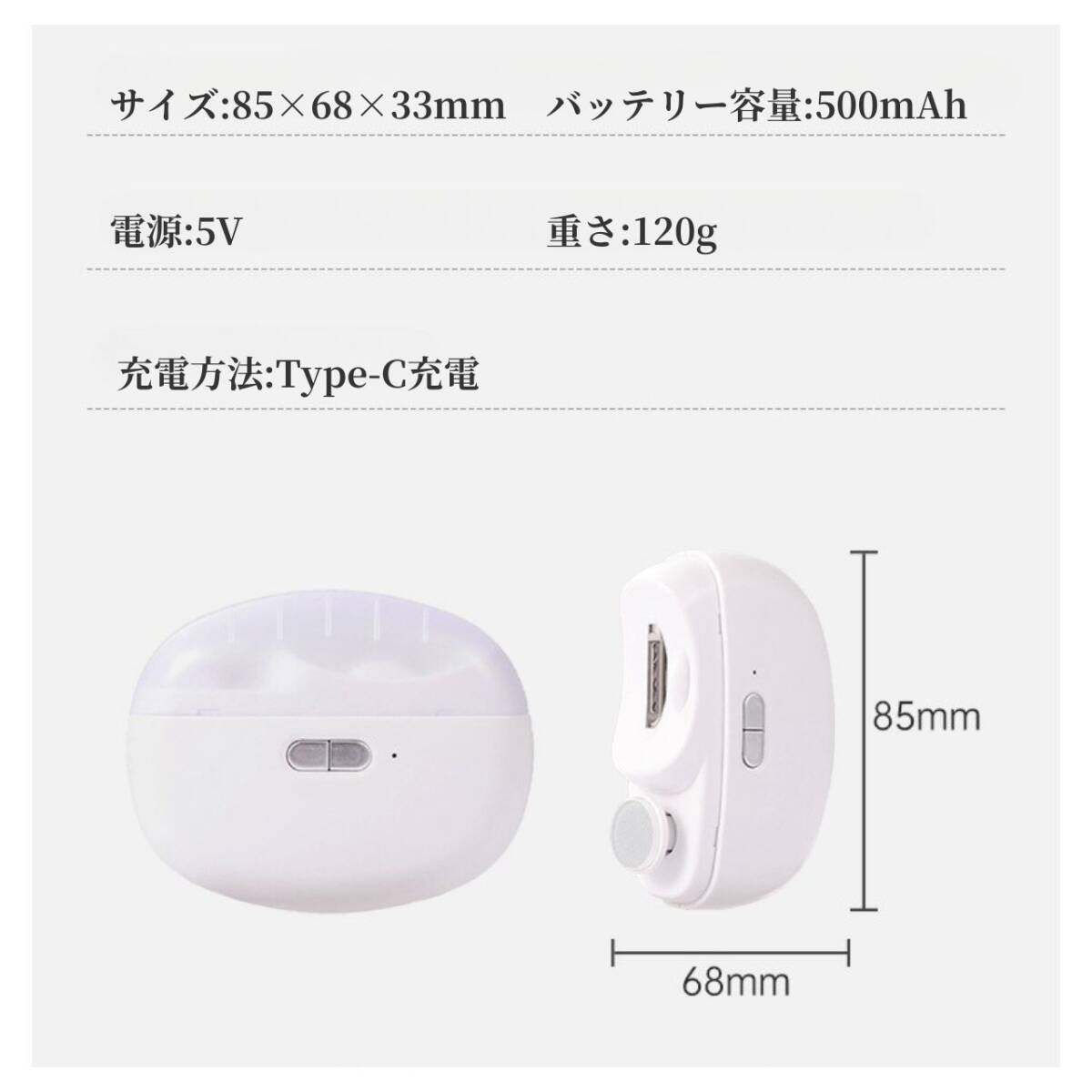 電動爪やすり 【カラー】 ピンク ホワイト、パープルの販売もございます。 【特長】 - 爪切りと爪磨きが1台で可能! - 徐々に爪の半円を描くように動かし、切りすぎを防ぐ。 - 360°回転式爪磨きで、爪の表面もピカピカ!清潔感アップ! 【2段階回転速度】 - 2段階のスピード調節可能。 - 爪削りダストが本体のダストボックスに溜まるので、捨てる際に便利。 【安全性とデュアルスピード調整】 - 2つの速度設定で効率的かつ安全にトリミング可能。 - 子供の柔らかい爪から硬い爪まで対応。 - 安全ロック設計でお子様も安心して使用可能。 【使用感&静音設計】 - 人間工学に基づいた設計で握りやすく、手に馴染む。 - LED照明搭載でトリミングが明瞭。 - 超静音設計で、使用時の騒音は約45デシベル。 【Type-C充電式】 - USBソケットやモバイルバッテリーなど、さまざまな機器で充電可能。 - コンパクトで持ち運びに便利、保証期間は1年間。 【爪切りと爪磨きが1台2役】 - 先進的な電動モーター技術で高速切削。 - サンディングヘッドでなめらかに仕上げ、ネイルチップ収納庫で清潔に保つ。 【使用方法】 爪磨きボタンと爪削りボタンを同時に2~3秒長押しすると、電源がオンになります(緑のランプが点灯)。 爪削り:右のボタンを押すと爪削りが動きます(弱モード)。もう一度右ボタンを押すと強モードに切り替わります。 爪磨き:左のボタンを押すと爪磨きが動きます(弱モード)。もう一度左ボタンを押すと強モードに切り替わります。 【注意事項】 ・送料の都合上、箱なしでの簡易包装での発送となる場合がございます。 ・海外製品の為、多少の傷や汚れがある場合がございます。 関連ワード 電動爪切り 爪切り 電動つめ削り 足の爪 2in1 爪磨き つめきり 角質ケア 爪やすり LEDライト付き 巻き爪 厚い爪 爪ケア USB充電式 ワイヤレス 2段階スピード 爪研ぎ 足爪用 赤ちゃん 介護用 高齢者 足用 男女兼用 敬老の日 ギフト プレゼント