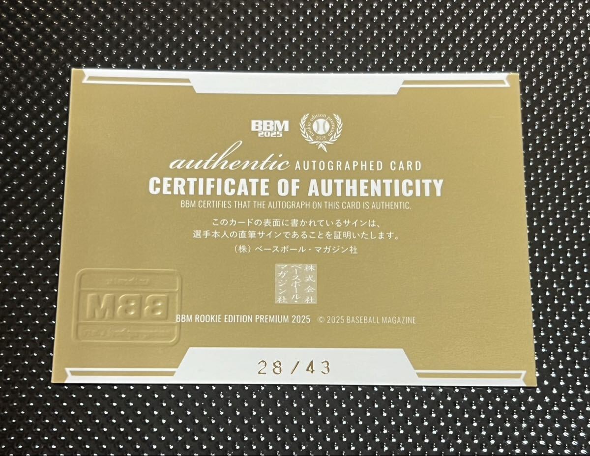 43枚限定 佐藤柳之介 2025 BBM REP ルーキーエディションプレミアム 直筆サインカード RC Auto 広島東洋カープ 28/43
