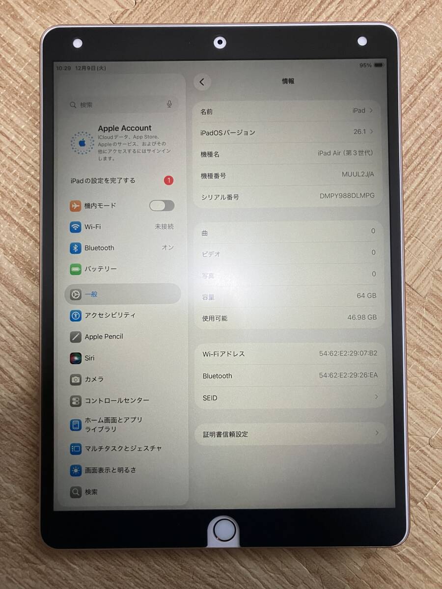 Apple iPad Air (第3世代) A2152 10.5インチ Wi-Fiモデル 64GB ゴールド (MUUL2J/A)【アクティベーションロック解除済】