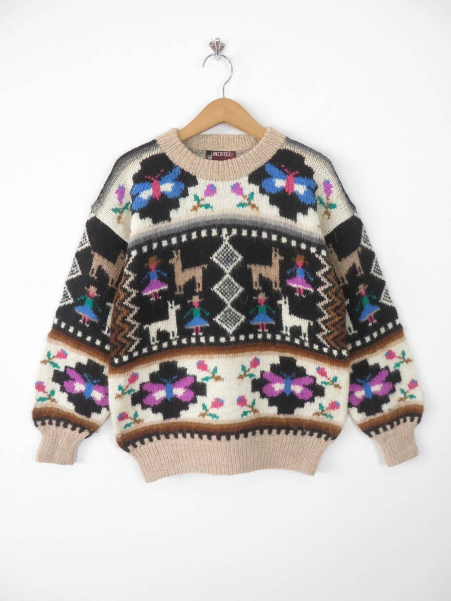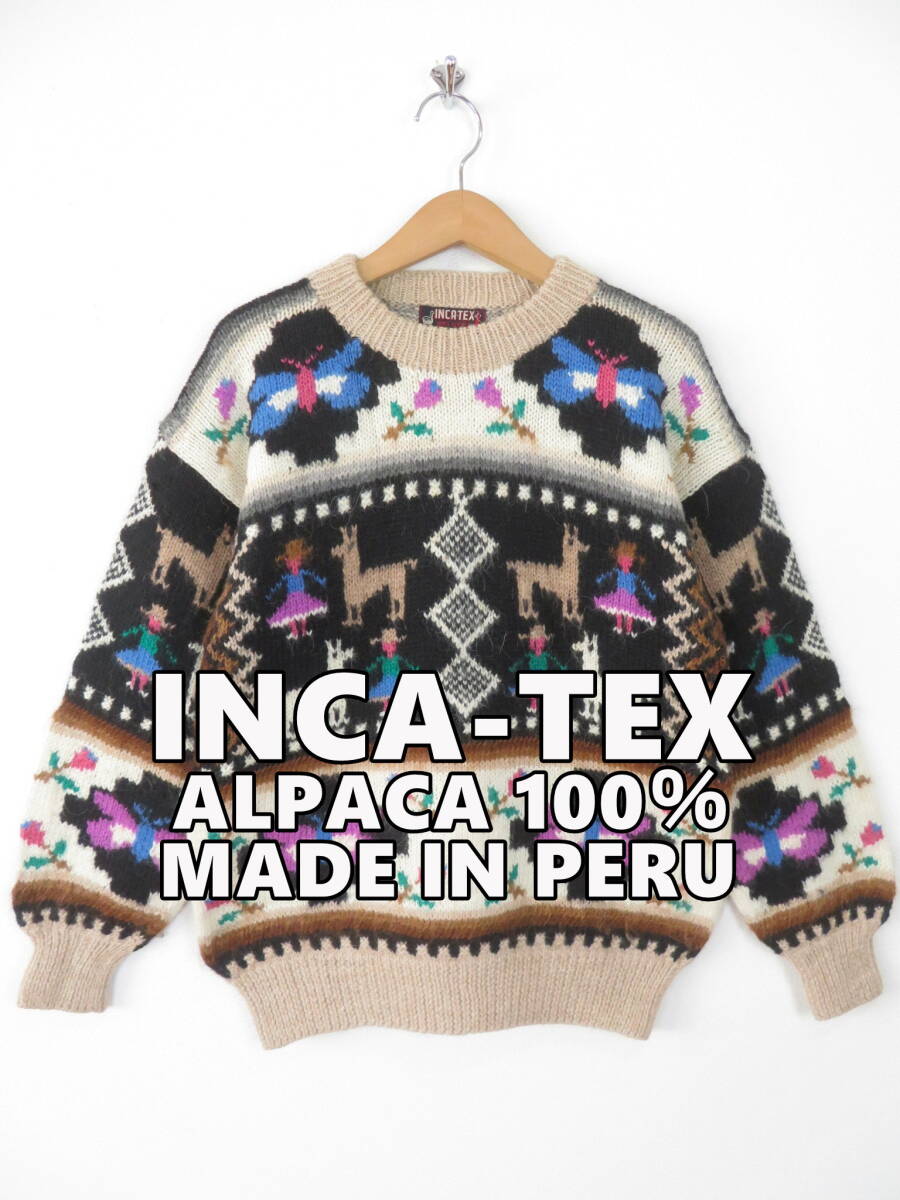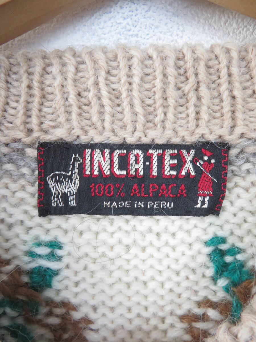 【美品】アルパカ100% 手編み ペルー製 ニット ベスト インカテックス カーディガン 幾何学模様 総柄 ハンド ニット メンズ レディース