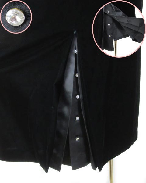 | 高級感の漂うベルベットの素敵なドレス。後ろのスリットから見える部分にはサテンが使われていてダイヤのようなキラキラなクリアーボタンがチラ見えします。シンプルなデザインなので、あわせるアクセサリーで雰囲気が変わります。流行に左右されないデザインなので、長く着て頂けます。 |