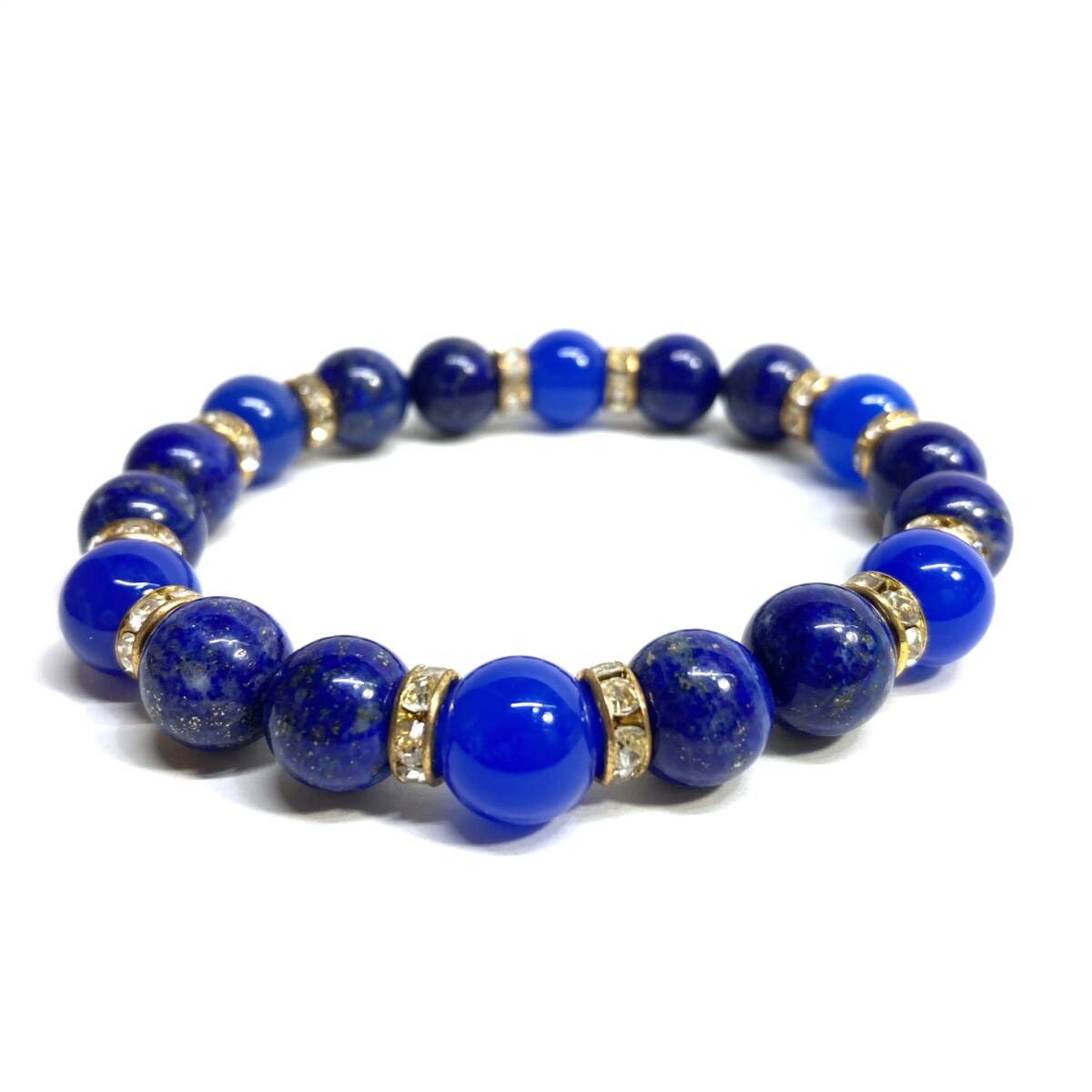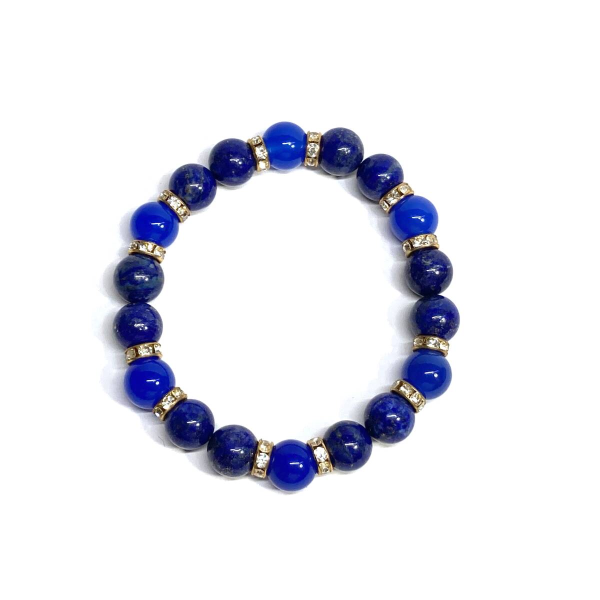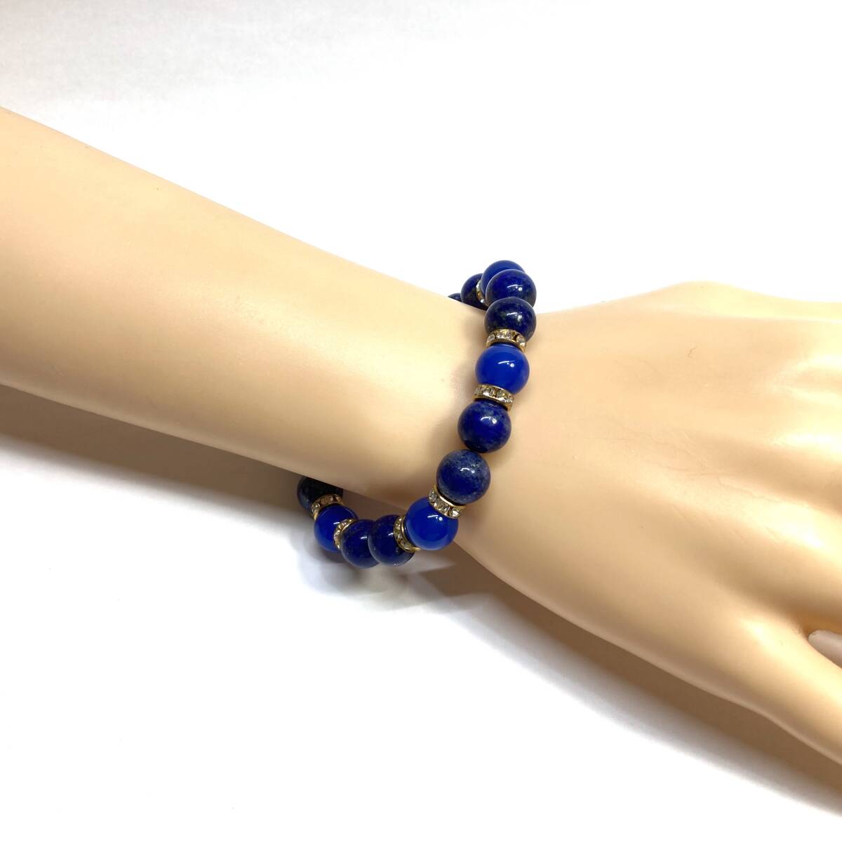 こちらは、ラピスラズリと青瑪瑙を組み合わせたパワーストーンブレスレットです。間にはロンデルを挟み高級感あるデザインに仕上げております。石大きさは腕にも馴染みやすいように10mm玉で内径約18cm(伸可能)です。(サイズ変更の場合は取引ナビにてご連絡をお願いします。) 数に限りがございますので気になる方はお早めにどうぞ。