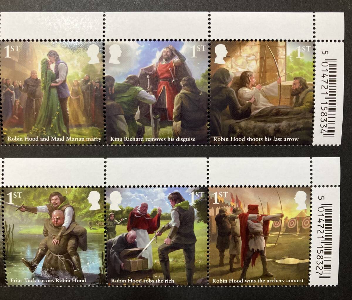 ●図案等:ロビンフッドの伝説 単片10種完(5種ストリップ×2) - イギリスの伝説的な英雄「ロビン・フッド」と、彼の仲間たちが織りなす物語の名場面を描くイラスト
