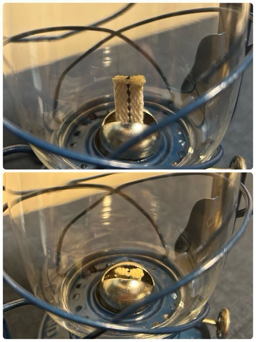 画像1枚目はサンプル品にパラフィンオイルを入れて実際に灯火してみた画像です。100円ライターではなく、少し長いライターか、マッチが点けやすいです。レトロなランタンに夜中に火を入れてみて、良い雰囲気でした。灯油も使えるようですが、パラフィンオイルを強くお勧め致します。