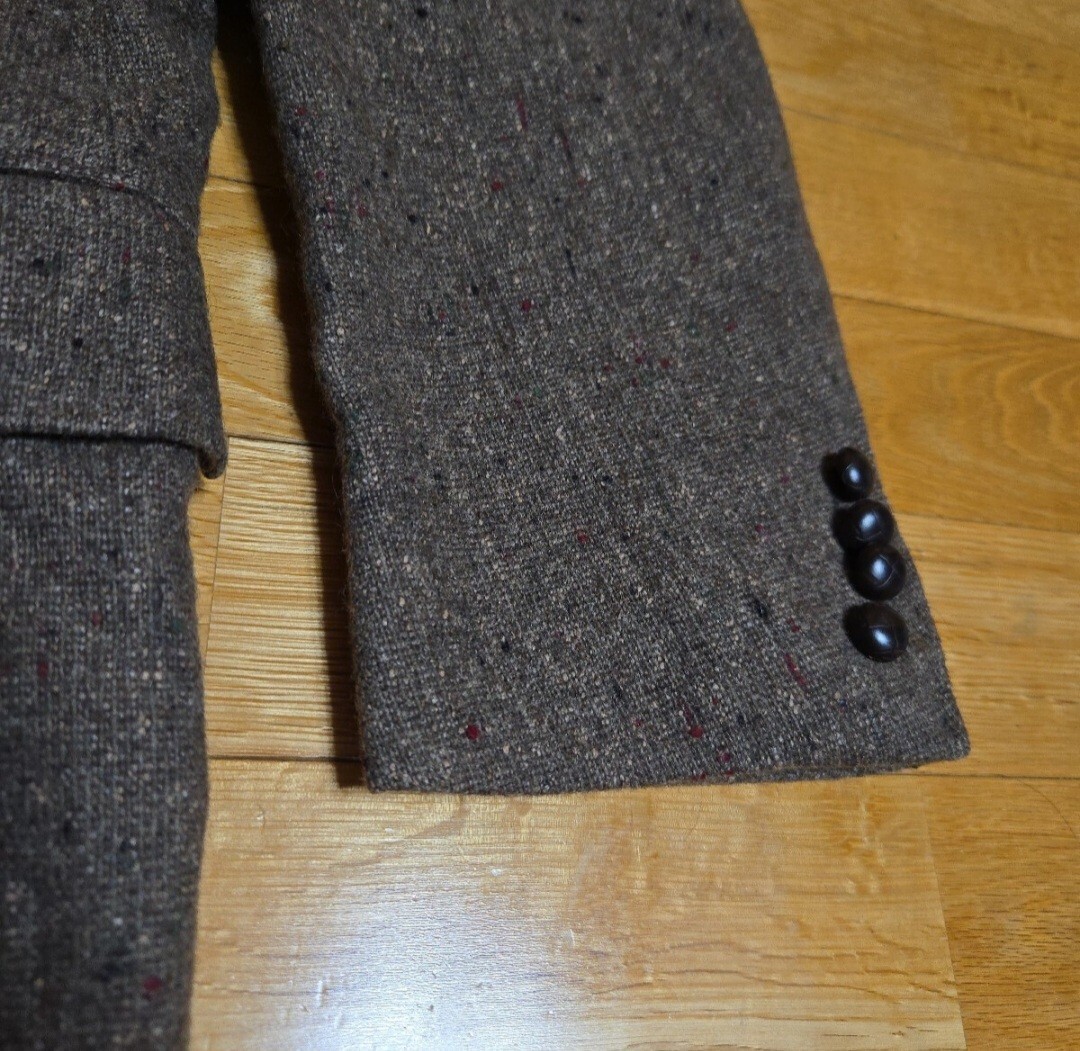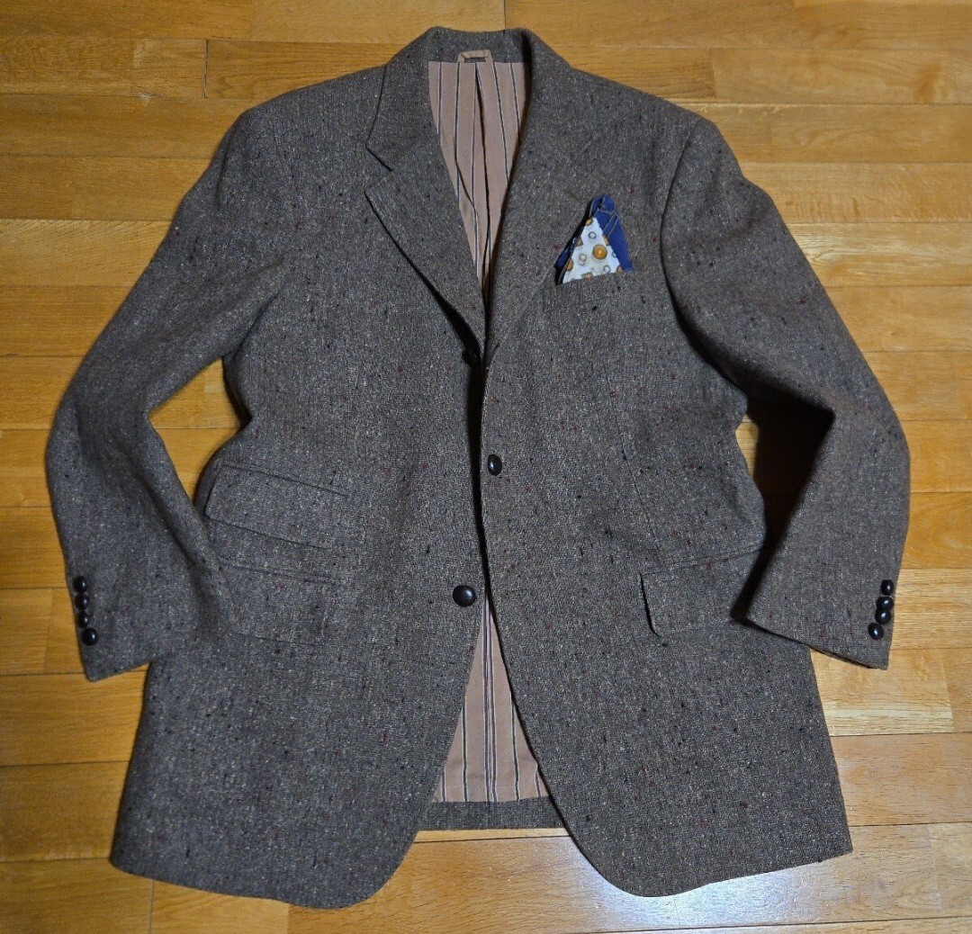 生地は非常に着心地が良い、柔らかな本格的なフラノツイードウールの風合いが特徴の素材感。上品な印象のジャケットでお勧めです。細身のスタイリッシュなデザインながらも、軽い着心地で、ラフにカジュアルスタイルにも、カチッとしたオンスタイルにも使用して頂けます。 シルエットは本格的な英国カントリー調の作り、シャープでスマートなオーソドックスなシルエットで、素材感のお色もこれからの時期に活躍します秋冬トレンド素材の上品なメランジ織り柄グレージュ、裏地は総裏仕立ての裏地がストライプ柄ベージュでお洒落。秋冬に着用して頂けます。