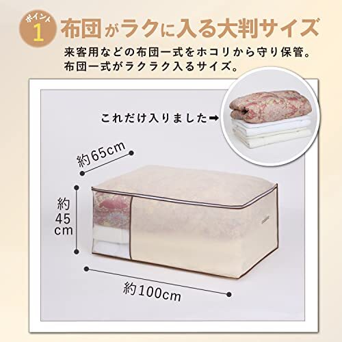 ・【商品仕様】:サイズ/約幅100×奥行65×高さ45cm、カラー/ベージュ、内容/1枚、収納目安/シングルサイズの敷き布団なら約2〜4枚・またはシングルサイズの布団一式(掛け・敷き布団各1枚)、材質/ポリプロピレン