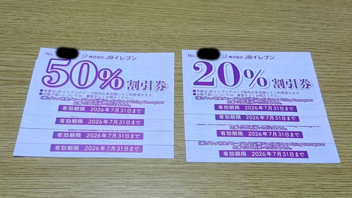 | <有効期限> 2026年7月31日 <ご優待内容> ◆20%割引券×4枚 ◆50%割引券×4枚 JBイレブンの店舗で利用できます。 詳細はホームページで確認してください 【他にも株主優待券出品しております】 【発送について】 普通郵便の場合、郵便ポスト投函をもって発送完了としております。 普通郵便で発送の場合、不着・遅延・破損等の郵便事故の責任は負いません。 ※日本では郵便の不着は皆無に等しいようですが、それでも不着が発生する可能性はあります。 ※日本郵便(株)が土日・祝日の配達をしなくなってから、普通郵便でのお届けに日数がかかるようになりました。 お急ぎの方は入札ご遠慮下さい。 | ||