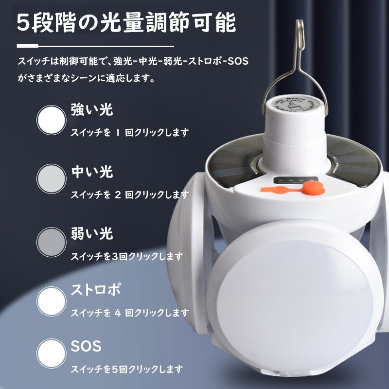 ■ 5つの光レベルが調整可能、スイッチを制御でき、強光-中光-弱光-ストロボ-SOSがさまざまなシーンに適応します。