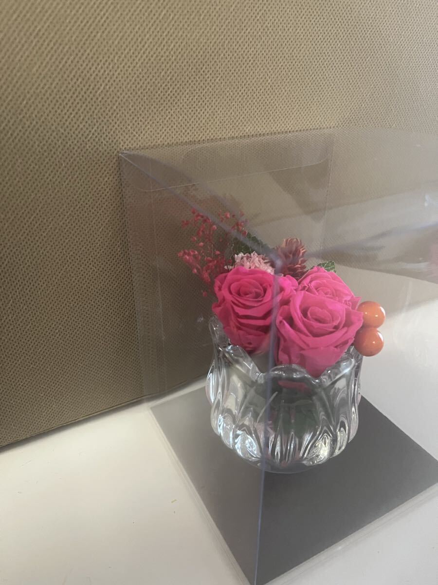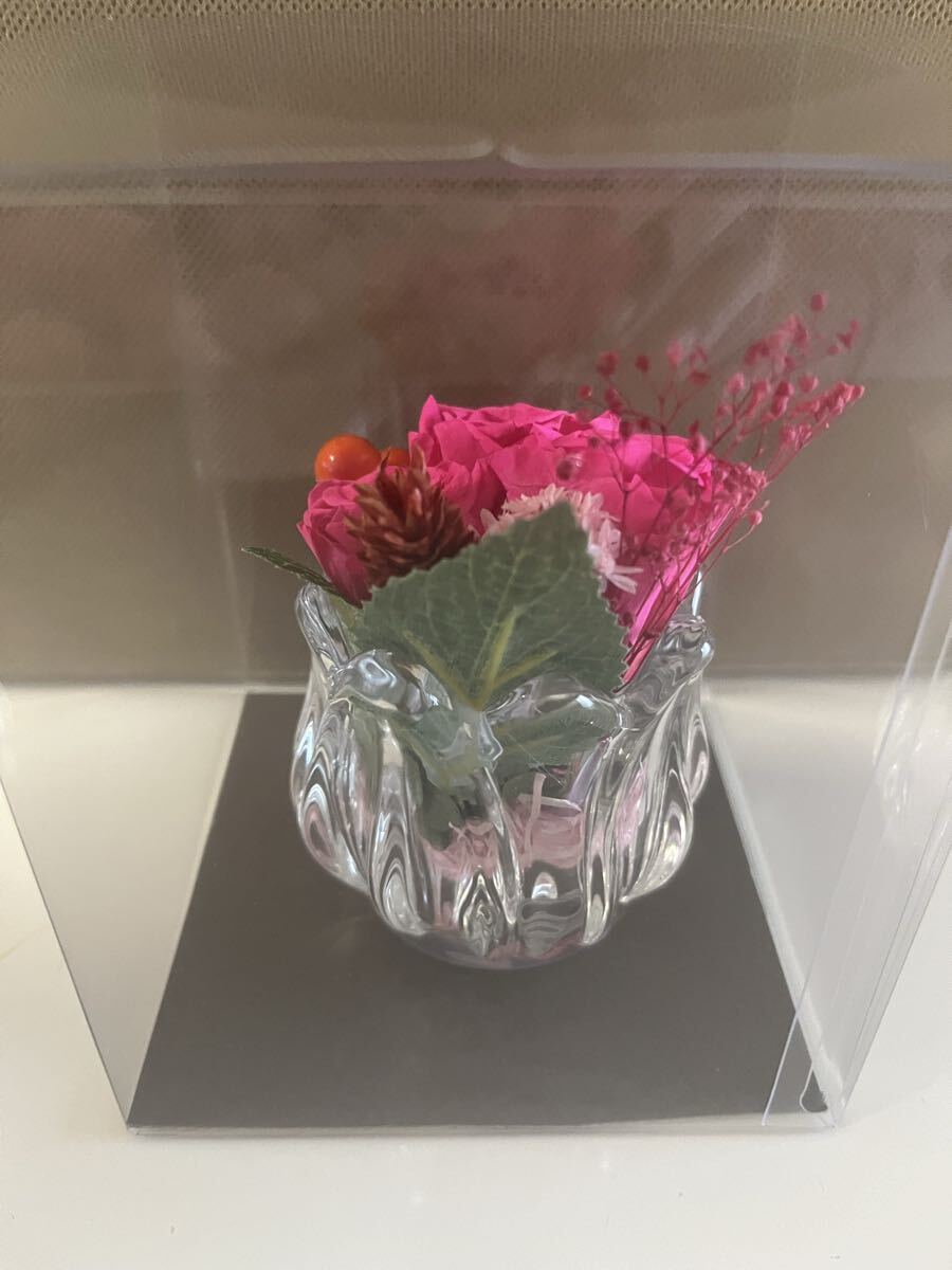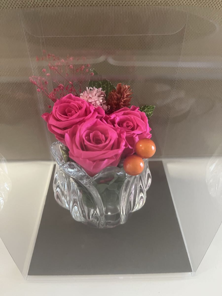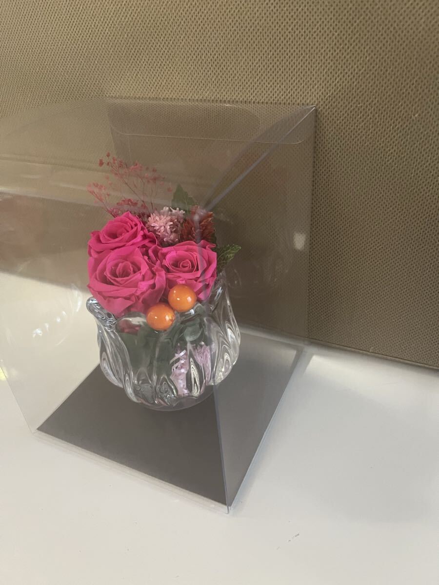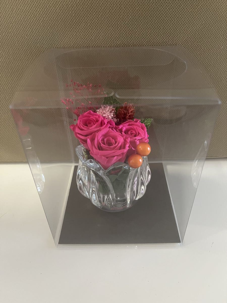 チューリップ型のガラス容器に鮮やかなピンクのプリザーブドフラワーのバラを主体に可愛らしくアレンジしました。アジサイ、ラグラス、スターフラワー、かすみそうなどで飾ってあります。