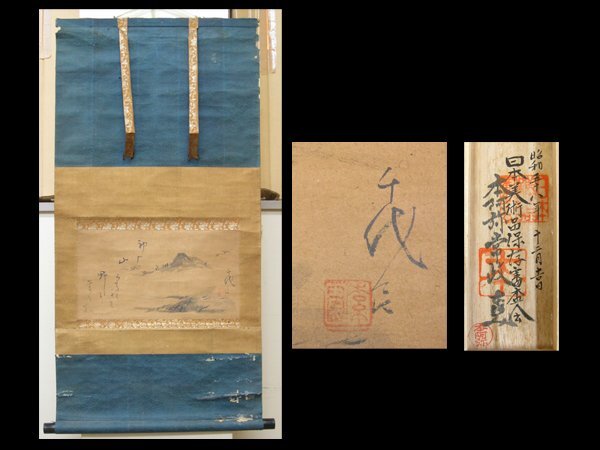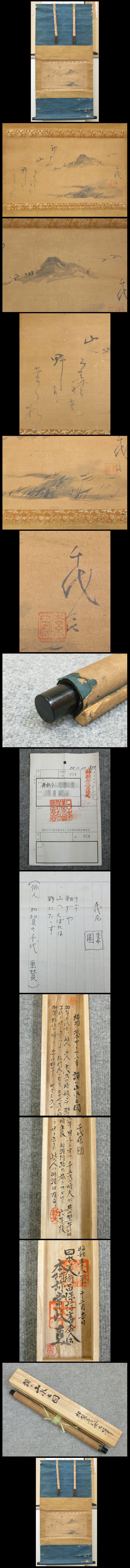【加賀千代女】 1703~1775年。江戸時代中期の俳人。 通称は千代女、千代尼。号は素園、草風。加賀(石川県)松任の表具屋の娘。 北潟屋に奉公し主人の岸大睡に俳諧を学んだという。 17歳のとき北陸地方巡遊中の各務支考に見いだされ、一躍中央の俳壇にも知られる。 さらに享保12年支考の門人仙石廬元坊の来訪をうけ「松任短歌行」をなした。 72歳の時、与謝蕪村の『玉藻集』の序文を書く。安永4年死去、73歳。 ★商品サイズ★ ■掛軸 97.5×48.5cm ■作品 21×38cm ★商品の状態★ 作品に時代のしみ汚れがあります。 表具に時代のしみ汚れ、剥げ、破れ、小穴があります。 ご承知のうえご入札をお願いします。 時代など詳しくは画像にてよく確認のうえでご検討いただければと思います。 どうぞよろしくお願いいたします。 ★真作と明記しております作品については、 万が一真作でない場合は、落札金額・送料をご返納致します。 また鑑定するにあたっての鑑定料・交通費・その他の経費は ご落札者様ご自身のご負担になります。 鑑定についての保証期間は30日とさせて頂きます。 |