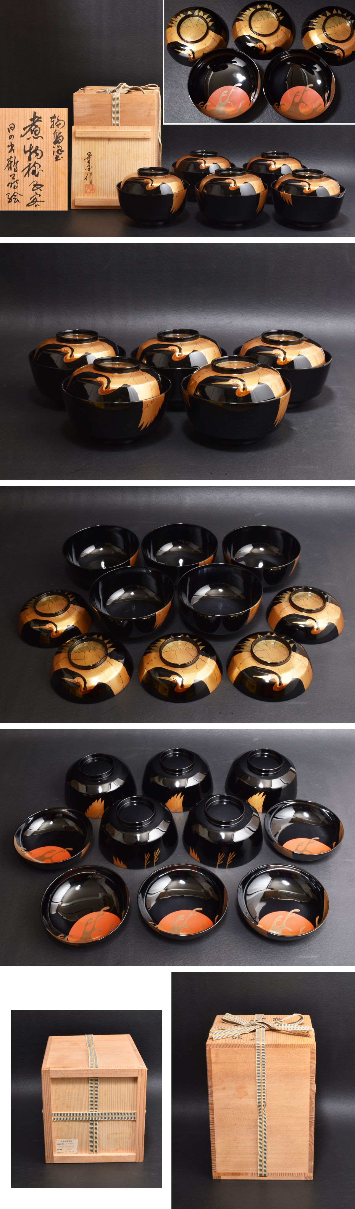 6211 輪島塗 煮物椀 日の出鶴蒔絵 5客 共箱 天然木 作家物