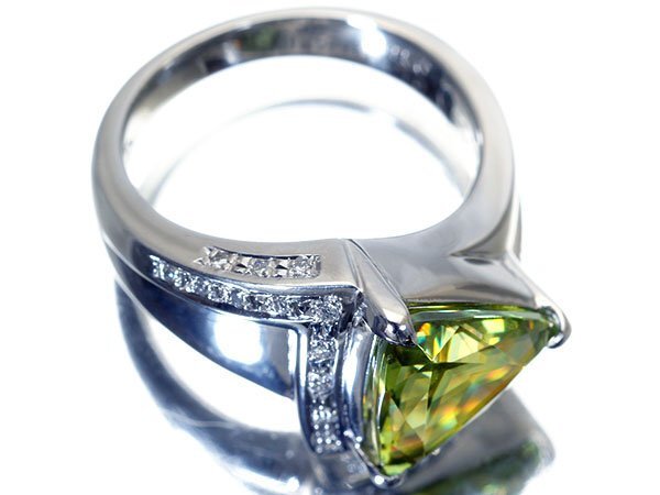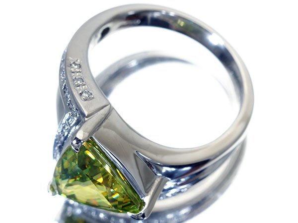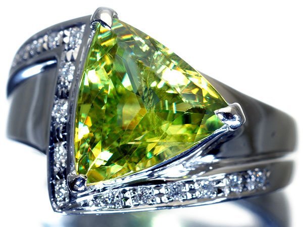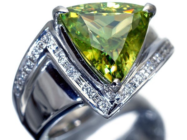 美しい色調とファイアを放つ超希少宝石のトリリアントカット大粒極上天然グリーンスフェーン4.50ct&極上ダイヤモンド総計0.13ctを素敵に宝飾した、超高級Pt900リングを1円から特別大放出致します!