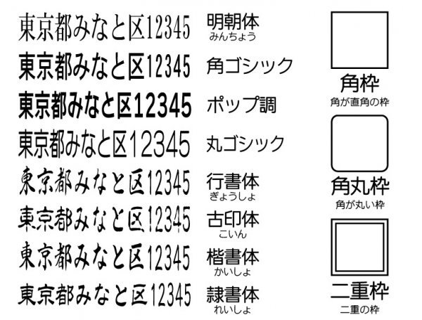②ご希望の書体(必須):明朝体/角ゴシック体/丸ゴシック体/ポップ体/楷書体(かいしょ)/行書体(ぎょうしょ)/隷書体(れいしょ)/古印体(こいん)