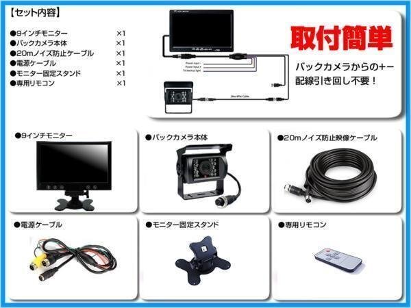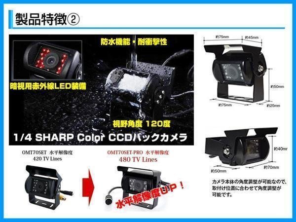 | ■24V車対応の液晶モニター + バックカメラセット 液晶モニターとバックカメラのセットなので、こちらのセットだけでバックカメラをご利用出来ます。 ■9インチオンダッシュ液晶モニター 9インチTFT液晶なので、バックカメラ用としては、十分な大きさです。 また、オンダッシュタイプのため、取り付け場所を選ぶことが出来ます。 ■赤外線LED搭載バックカメラ 赤外線LED搭載モデルのため、視認性が低下し易い夜間でも一定の視認性を確保出来ます。 また、広角カメラなので視認性も高く、より確実な確認が出来ます。 ■ノイズ対策済み 24V車向けカメラでありがちなノイズを軽減出来るノイズ対策済みの専用ケーブルを採用! |