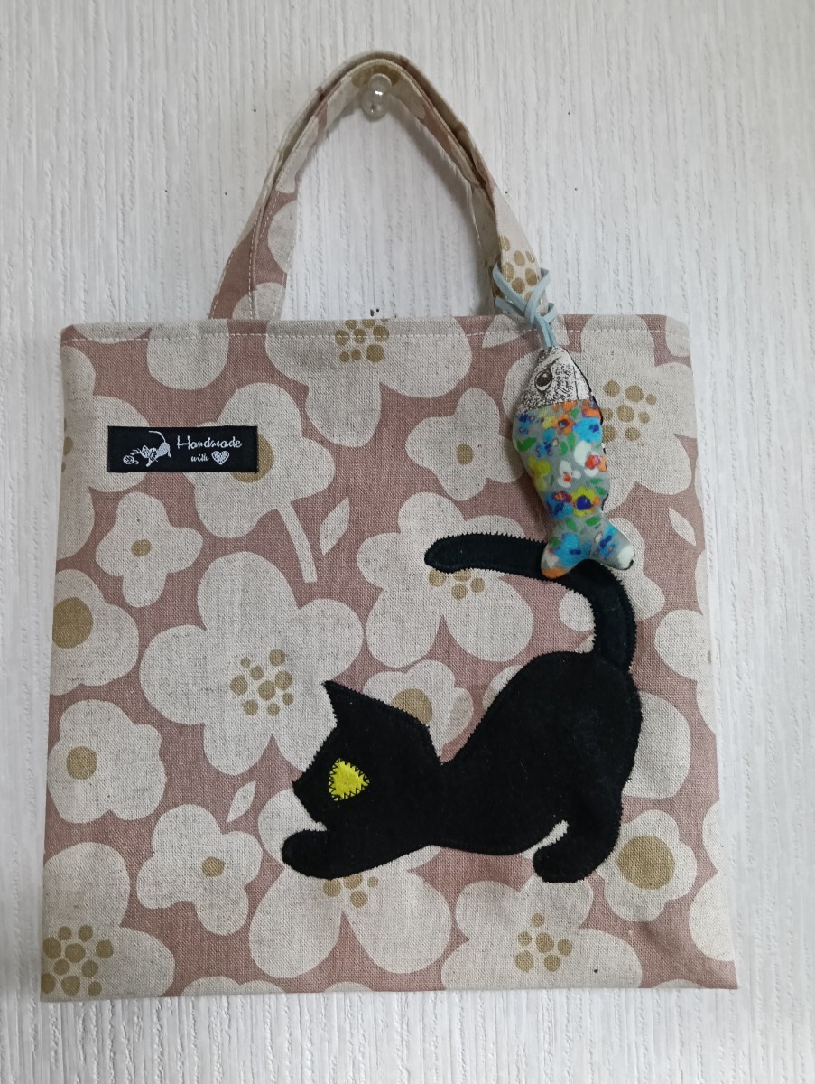 可愛い猫ちゃんのアップリケ入ミニバッグです。お散歩のお供にどうぞ。プレゼントとしても喜ばれています。