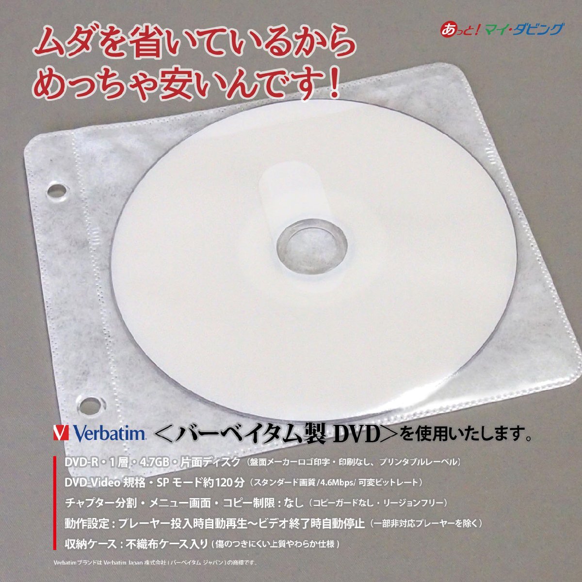 バーベイタム製DVD-R(片面1層・4.7GB・白色盤面) 不織布ケース入り(傷のつきにくい上質やわらか仕様) ※プリンタブルレーベルですので、お手持ちの対応プリンターでご自由にタイトル印字していただけます。 |