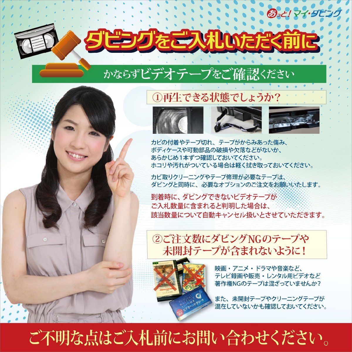 万が一、これらに該当するご入札であった場合は、残念ながらお取り引き不成立となりますので「落札者都合によるキャンセル」とさせていただきます。 1. テレビ録画や市販・レンタルビデオは「個人利用」「ご本人出演」であっても著作権法に抵触するため、ダビングを承れません 2. アダルトビデオやプライバシー侵害など公序良俗に反するビデオはダビングを承れません 3. カビ付着、劣化などにより正常に再生できないビデオはダビングを承れません 4. ご落札金額以外に別途見積が必要なビデオテープはダビングを承れません(テープ損傷、120分を超える録画など) |