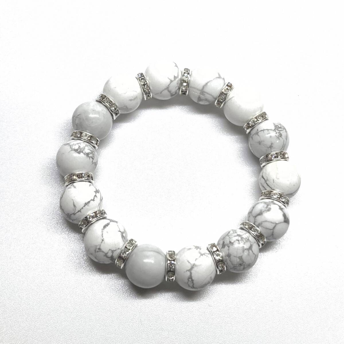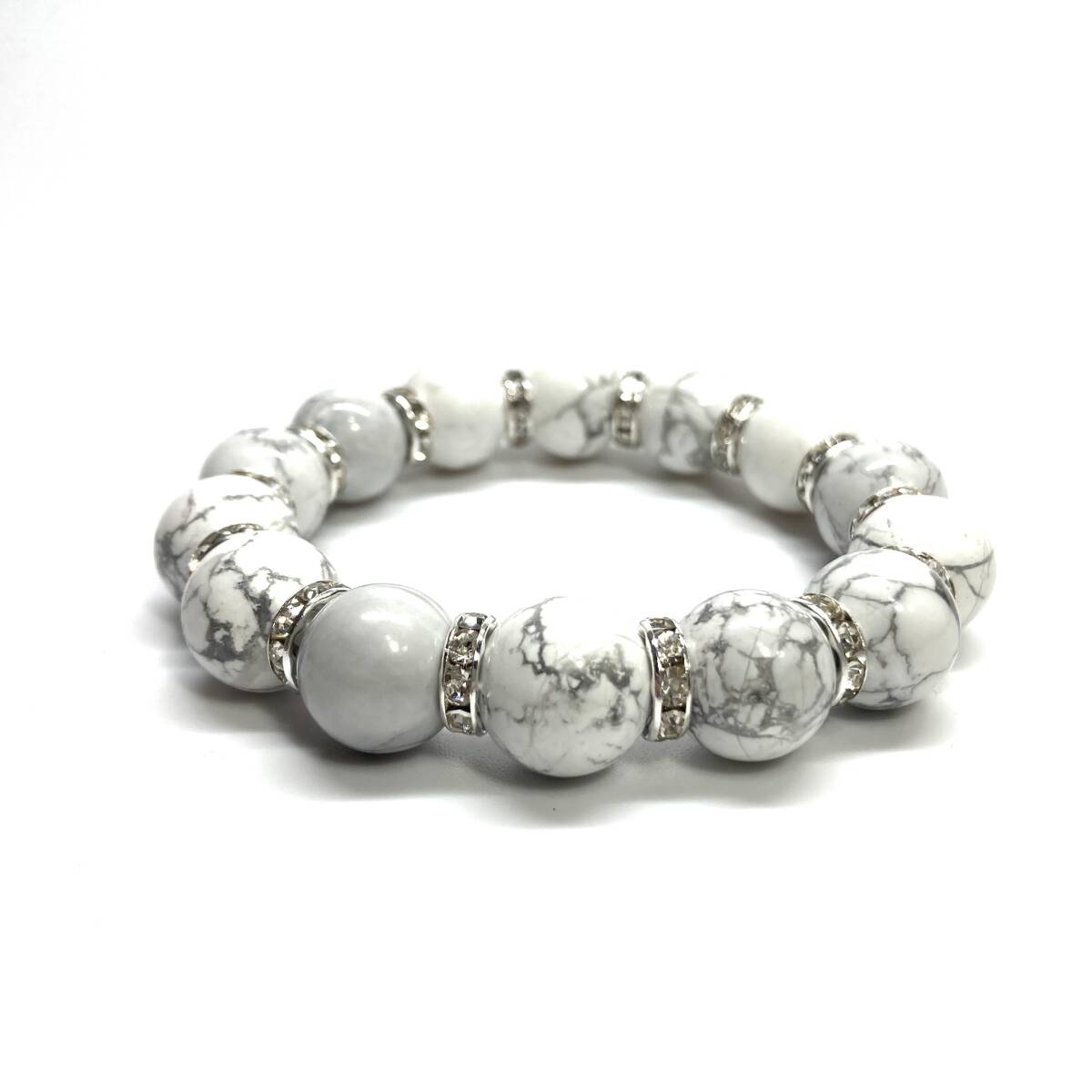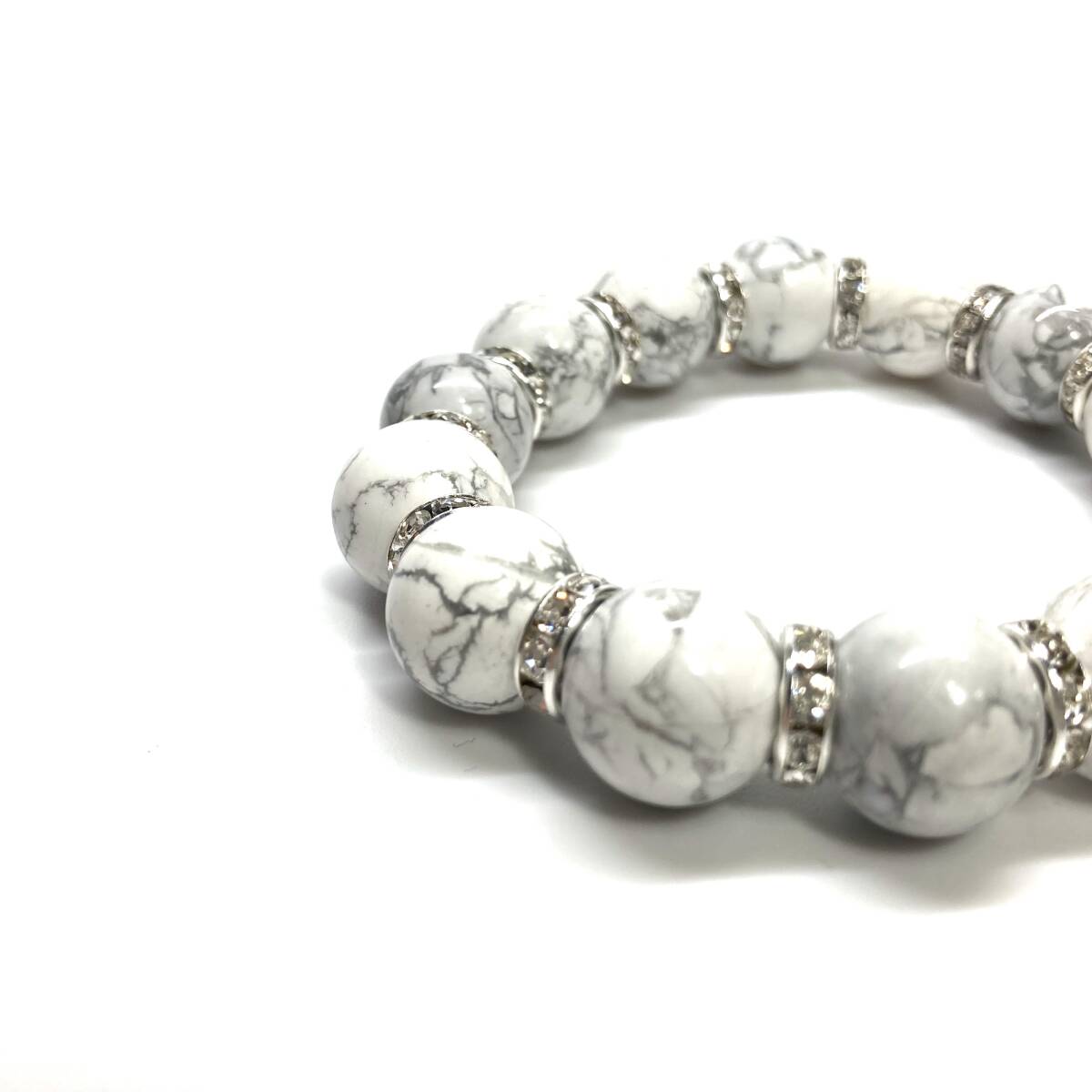こちらは、14mm玉のハウライトを使用した天然石ブレスレットです。石との間にはロンデルを挟み高級感を演出しています。シンプルなデザインですのでどんなコーディネートとも合わせ易いブレスレットです。石大きさは14mm玉です。内周約17cmです。パワーストーンを付けてる方へのプレゼントにもお勧めです。14mmサイズのリクエストが多々ありましたので少量ですが販売しました。気になる方はお早めにどうぞ。