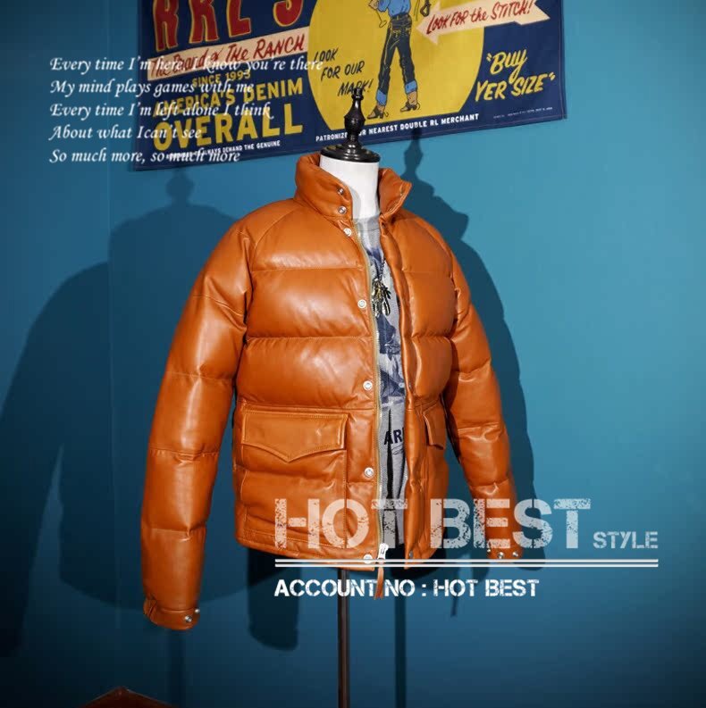 シープスキン(羊革)のオレンジカラーが目を引く、シングルライダースHEROレザーダウンジャケット。