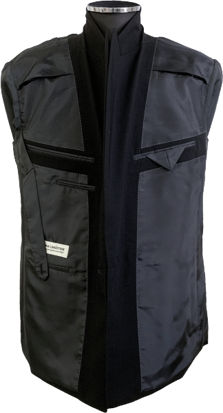 ■その他特徴:表地には、経糸、緯糸とも精紡交撚糸を使用。平織りの為薄く、軽量で通気性に優れています。精紡交撚糸独特のシャリ感、清涼感。オフスケール濃染加工により深みのある黒。ナチュラルストレッチで着心地快適。スラックスはアジャスター付きで、ウエスト±6cm調節可能。