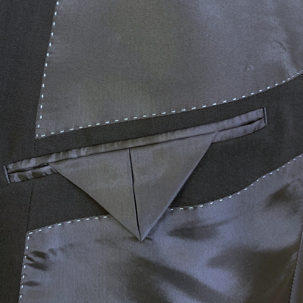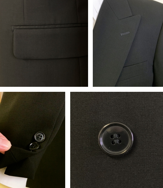■上 衣:ラペル毛芯仕様、ノーベント、背裏背抜きパイピング仕様、胸箱ポケット、左右腰ポケット(フラップ付)、台場仕立て、左右内ポケット(左、寿ポケット)、メガネポケット、タバコポケット
