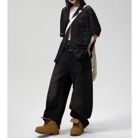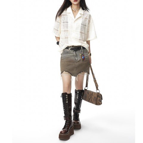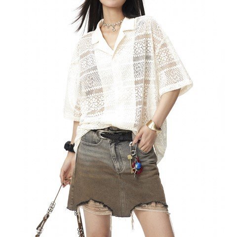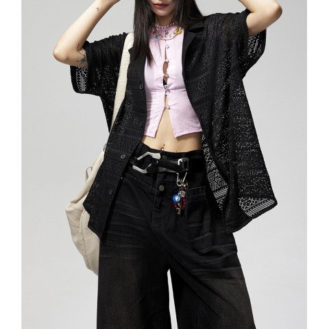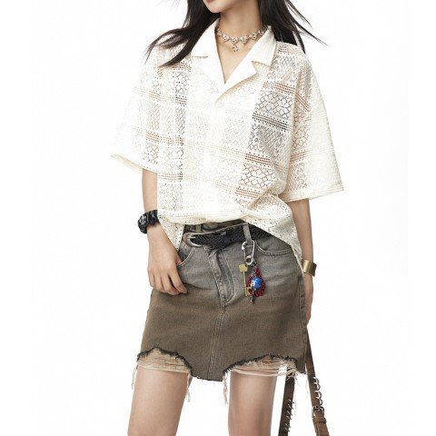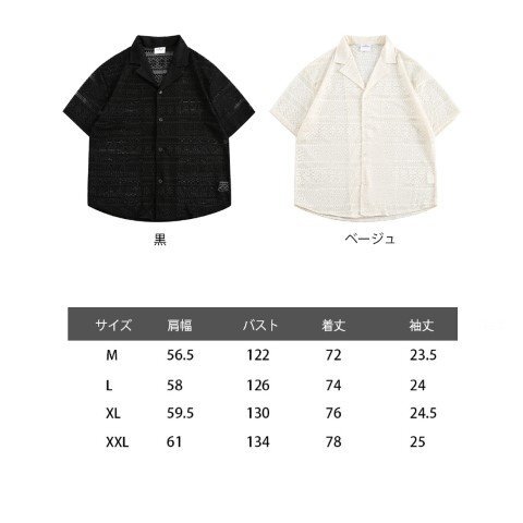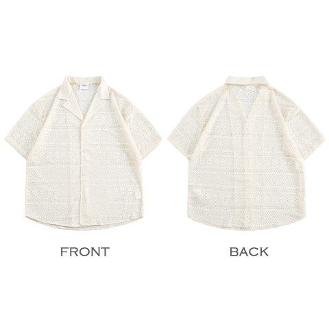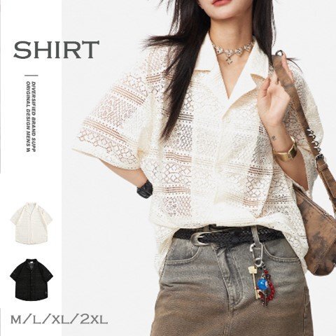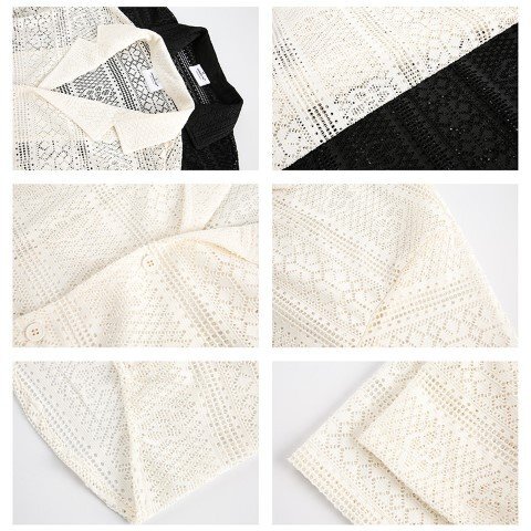 ・透け感のあるレースが印象的な襟付きシャツ。インナー次第でアレンジが自由自在。