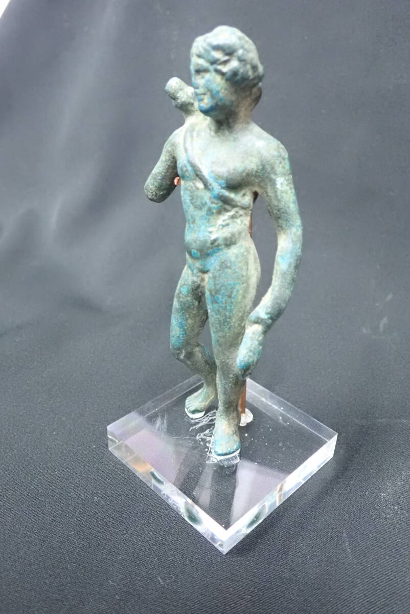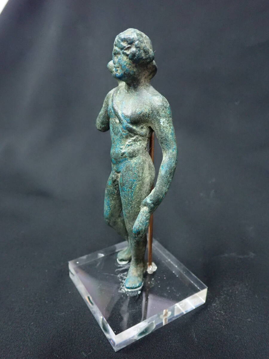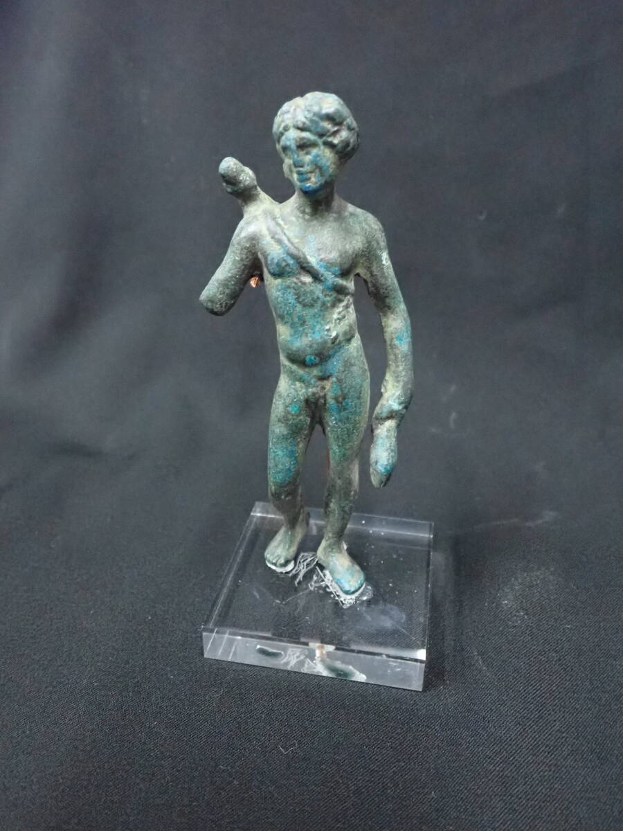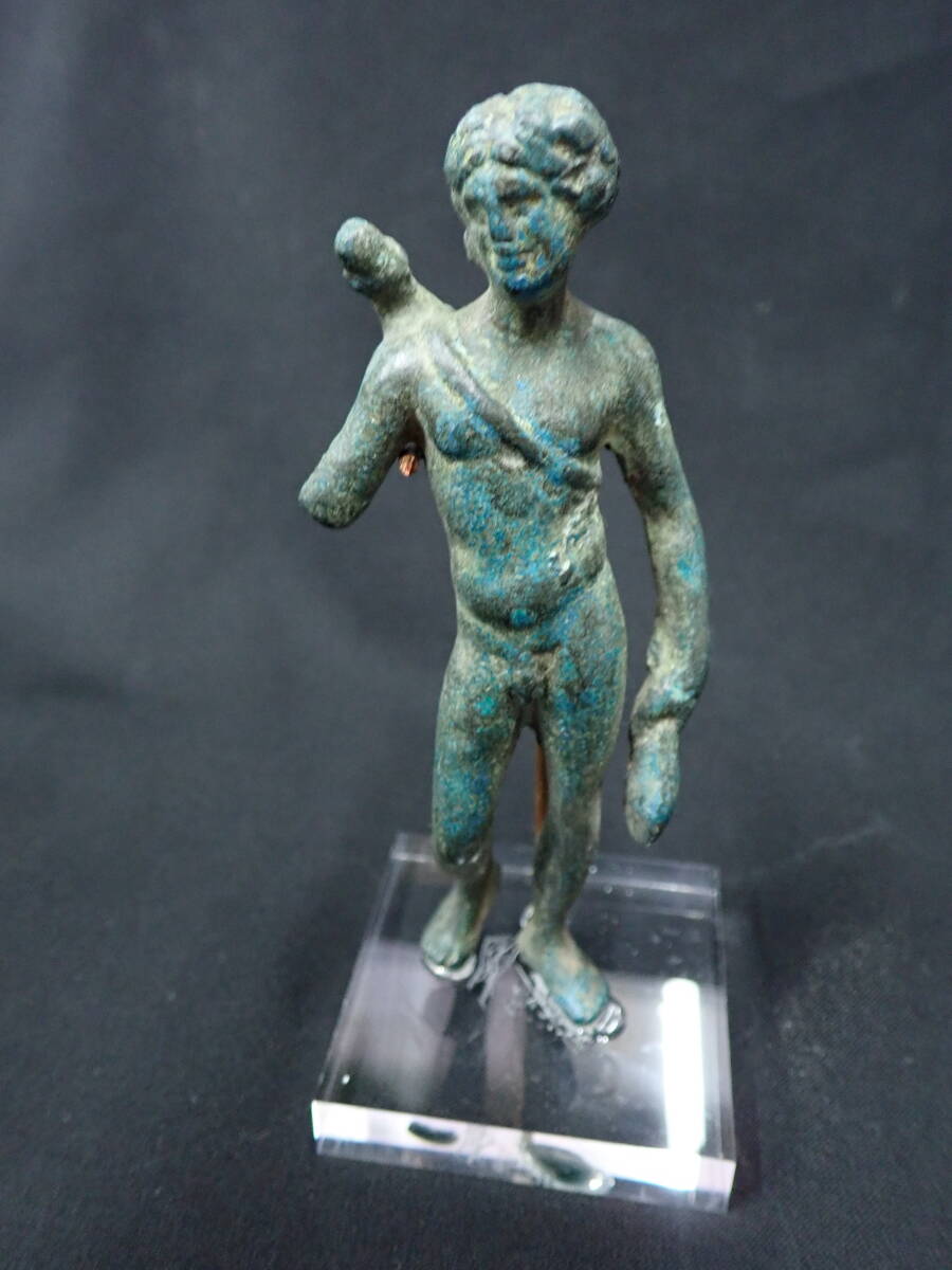 古代ローマ期、紀元後200~2300年頃の青銅像で、アポロンを象ったものです。時代の傷みは見られますが、造形もよく、人物の全体の姿をとどめる貴重なものです。コレクションとしてお楽しみいただけます。       本体約11cm