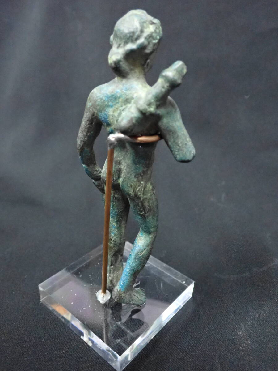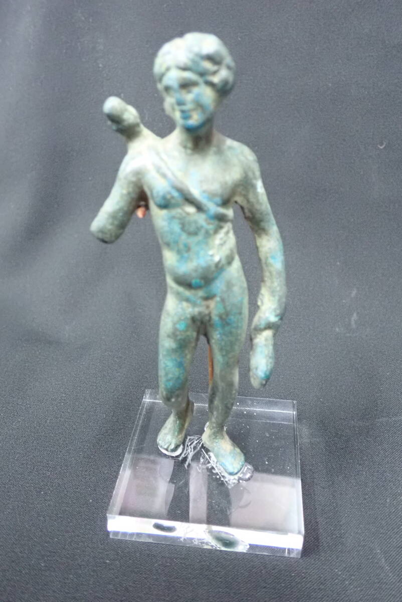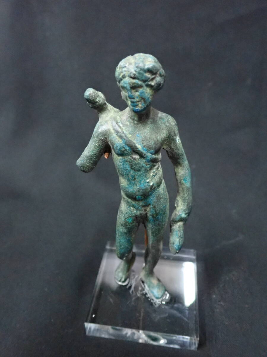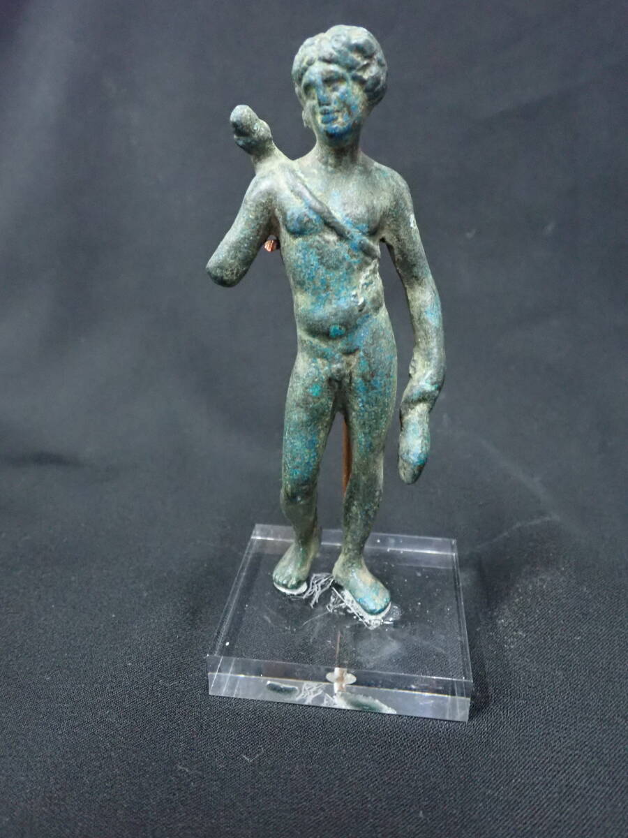 古代ローマ期、紀元後200~2300年頃の青銅像で、アポロンを象ったものです。時代の傷みは見られますが、造形もよく、人物の全体の姿をとどめる貴重なものです。コレクションとしてお楽しみいただけます。       本体約11cm