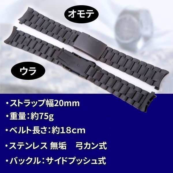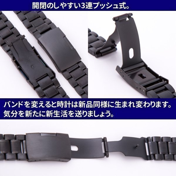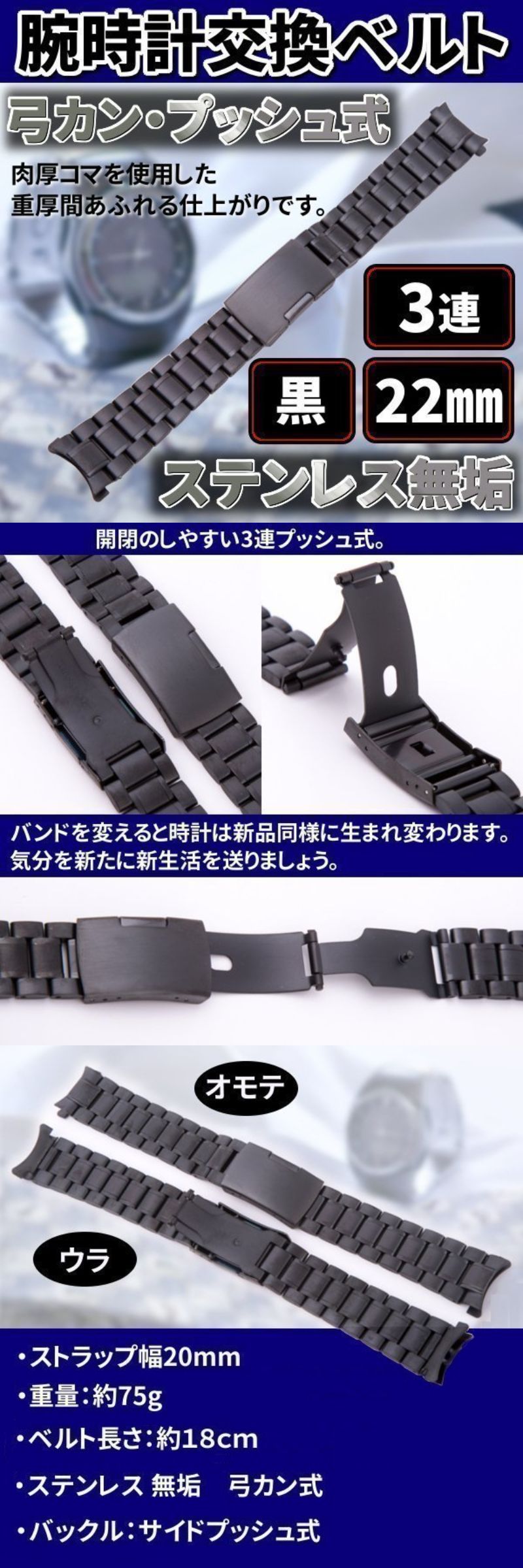 ★送料無料 腕時計 交換ベルト ステンレス 無垢 3連 22mm 弓カン プッシュ式 黒 金属 バンド 予備 カスタム パーツ