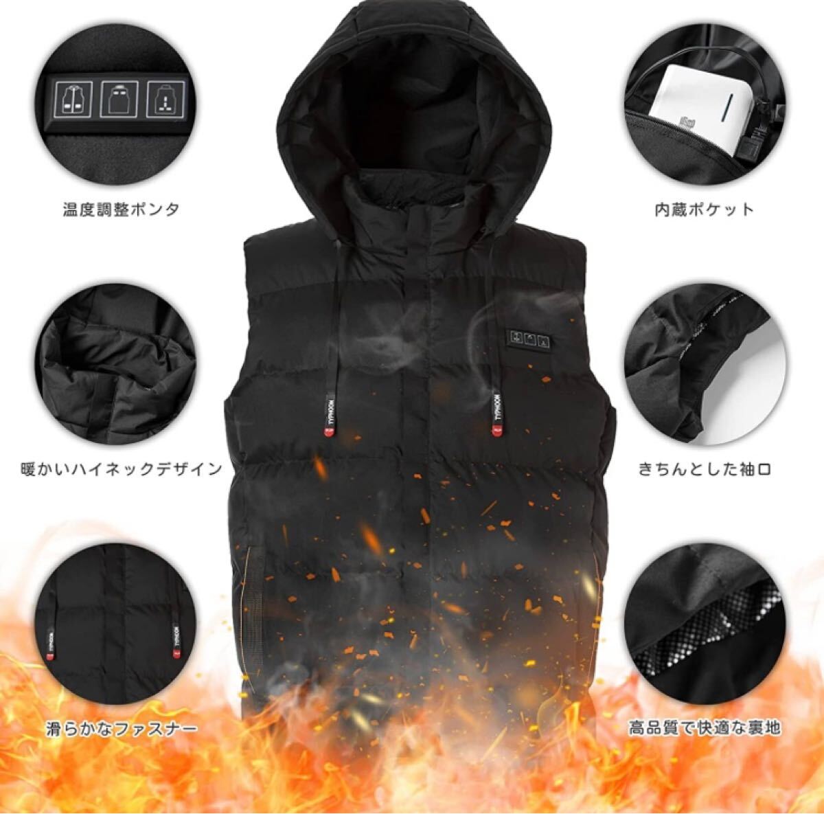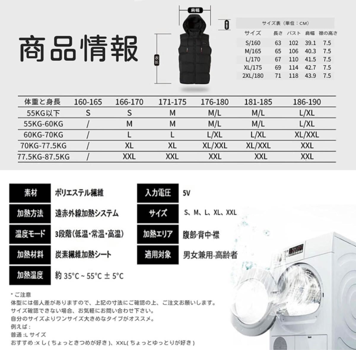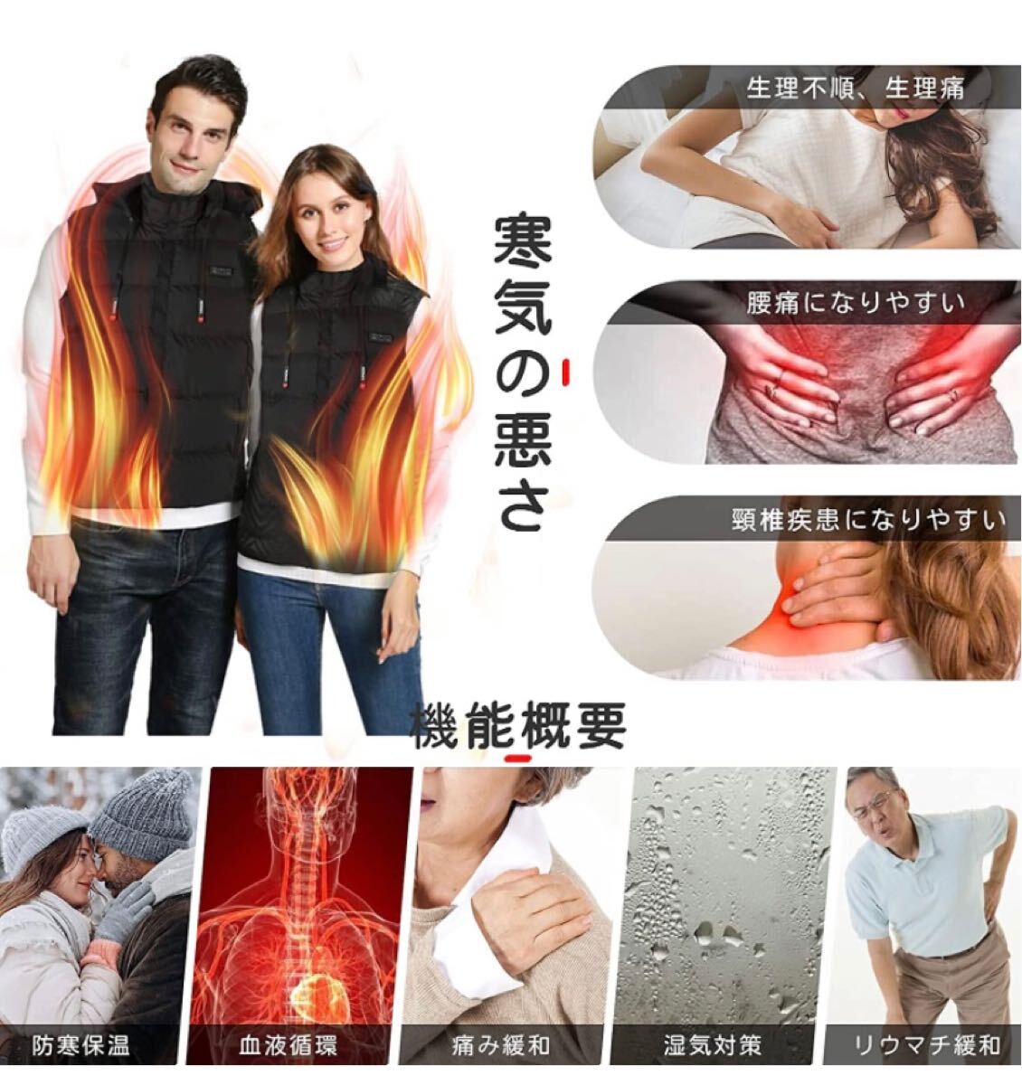日本製最新な炭素繊維材質と輸入した優れるTPU加熱シート材質を採用しております。前面に2つ、背面に7つの加熱ヒーターが内蔵され、しっかり温めてくれる発熱ベストです。男女兼用で、9箇所を効率よく温まるので、冷えやすい寒い季節として保温できる電熱ベストです。
