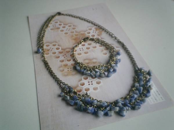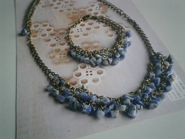 デニム・コレクション・・シリーズです♪初夏のブルー色・・爽やかなラピスのネックレスとブレスレット2本セットです♪♪深い藍色やブルーグレーや群青色がアートな表情のデニムラピスは3ミリから6ミリ位のさざれです♪2連のチェーンに繋いで可憐な表情です♪ネックレスの長さは全長55センチ位で調節自由です♪♪チョーカー風にされても素敵です♪ブレスレットの長さは全長23センチ位で調節自由です♪♪同じシリーズのネックレスやブレスレットも出品しています♪♪シンプルで飽きのこないいつまでも着けられるデザインを考えて作りました!ハンドメイドをご理解頂いてノークレーム、ノーリターンでお願いします