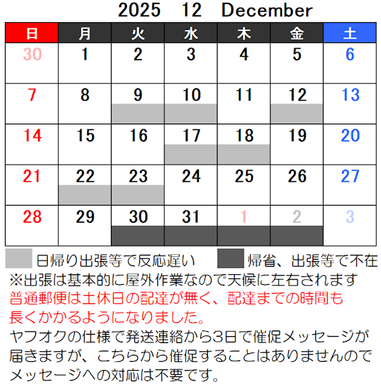 会社員のため発送準備は基本的に夜になります。また、出張や帰省等外出で対応出来ないことがあります。