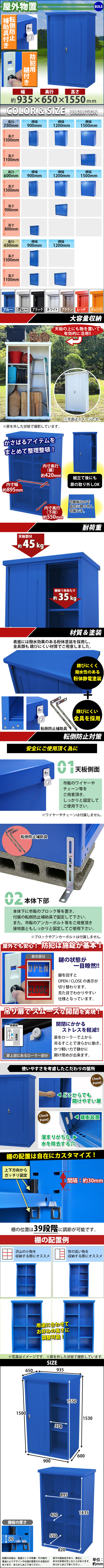 | 商品名 | 送料無料 屋外物置 スチール製 家庭用収納庫 鍵付き 青 幅約935mm×奥行約650mm×高さ約1550mm 倉庫 納屋 物置き スチール物置 スチール収納庫 ガレージ 収納 可動棚 吊り戸 吊戸 吊り扉 上吊り 吊引き戸 庭 ガーデン ブルー monookishw9d60h15bl |