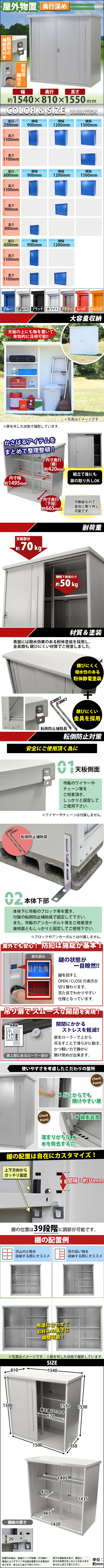 | 商品名 | 送料無料 屋外物置 スチール製 家庭用収納庫 鍵付き 灰 幅約1540mm×奥行約810mm×高さ約1550mm 倉庫 納屋 物置き スチール物置 スチール収納庫 ガレージ 収納 可動棚 吊り戸 吊戸 吊り扉 上吊り 吊引き戸 庭 ガーデン グレー monookishw15d75h15gr |