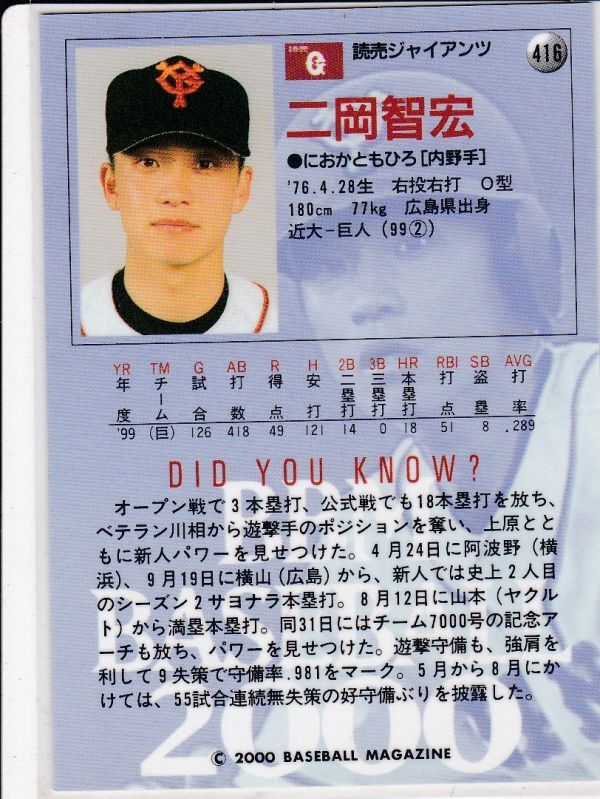 ●2000BBM 【二岡 智宏】 BASEBALL CARD No.416:巨人 R2