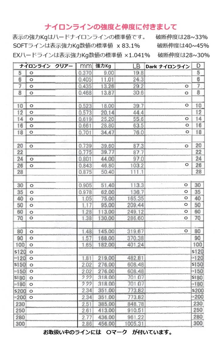 ◎その他のナイロンラインも各種取り揃え、ご注文をお待ちしています。