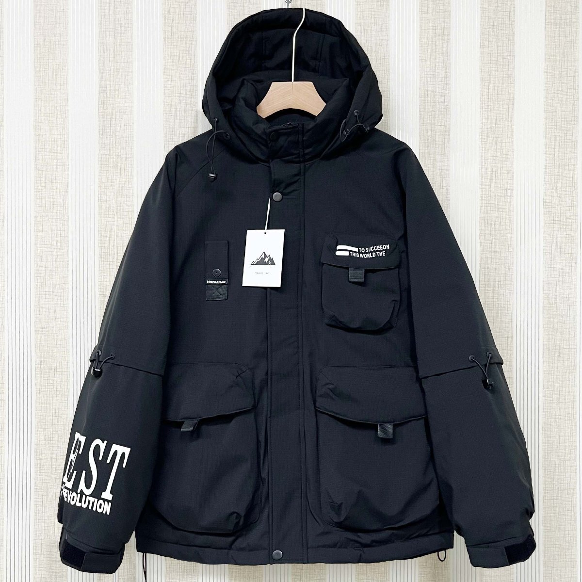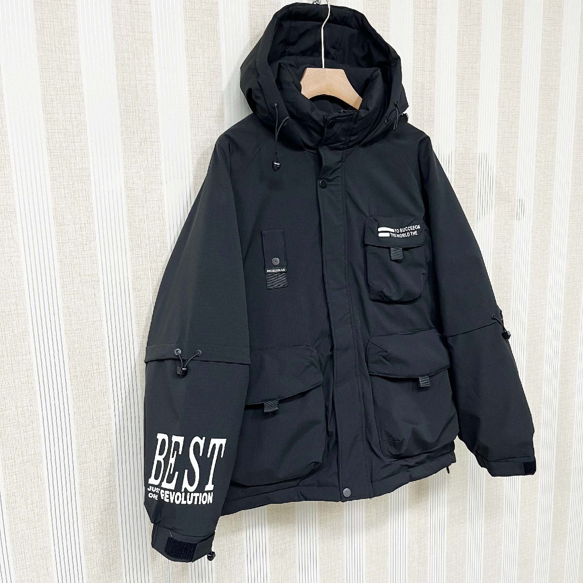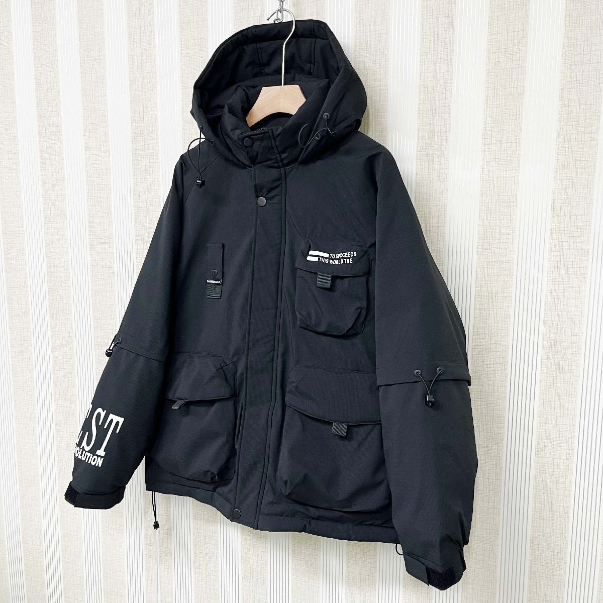 背中・右腕・左胸にはインパクトのある英文プリントを配置し、シンプルさの中に都会的なアクセントを加えたモードな一着。袖口にはフィット感を調整できる魔術テープを採用し、風の侵入を防ぎつつ動きやすさも確保。フードにはスマートに調整できるドローストリング、手元と裾にも締め具合を変えられるアジャスターを装備し、体型やシーンに合わせたシルエットを楽しめます。ポケットは二重構造で、外側には落下防止のフラップデザインを採用。前立てはボタンとファスナーのダブル仕様で、保温性・防風性を高めると同時に、見た目の上質さも演出します。