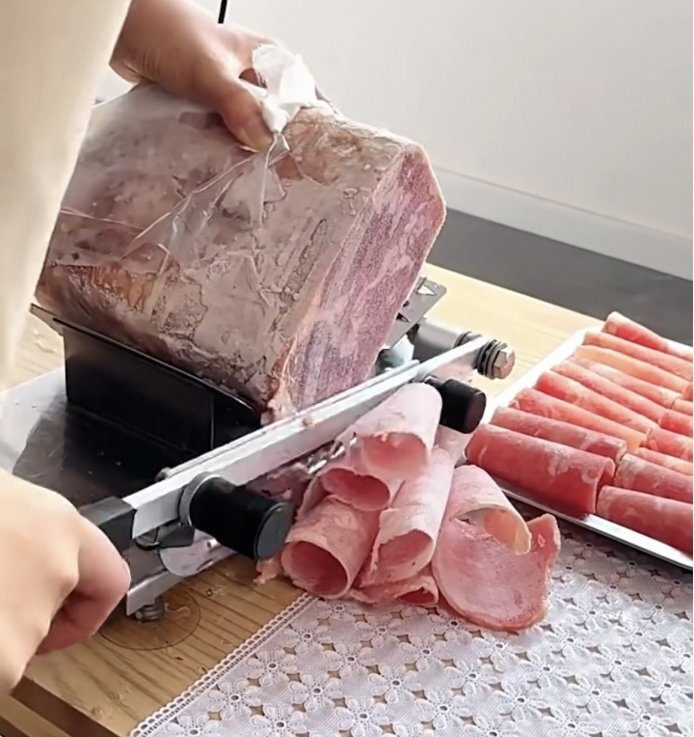 多目的ミートスライサー:豚肉、牛肉、野菜なども使えます。冷凍肉もスライスできます。硬い野菜を簡単に切ります。自動的に肉送り装置付けので、より簡単、省力、安全に肉を切りました。