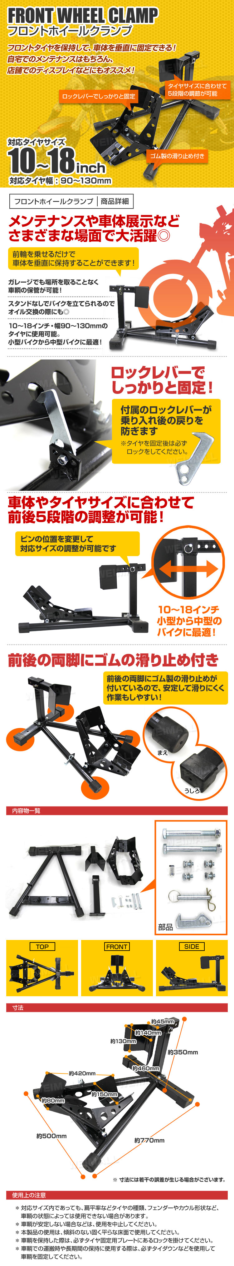 | フロントタイヤを保持して、車体を垂直に固定できる! 自宅でのメンテナンスもちろん、店舗内のディスプレイにもおすすめ!! 前輪を載せるだけで、車体を垂直に保持することができます。 ・ガレージの場所を取ることなく保管が可能! ・スタンドなしでバイクが建てられるのでオイル交換などでも活躍!! ・10~18インチ(幅90~130mm)のタイヤに使用可能! 小型バイクから中型バイクに最適です。 車体やタイヤサイズに合わせて、前後5段階の調整が可能!! 前後の両足に滑り止めのゴムつき。 【商品仕様】 ・本体サイズ:500×770×350mm ・適応タイヤサイズ:10インチ~18インチ ・90mm~130mm幅までのタイヤ 【注意事項】 ・対応サイズ内であっても、扁平率やタイヤの種類、フェンダーやカウルの形状など、車両の状態によっては使用できない場合があります。 ・車両が安定しない場合には、使用を中止してください。 ・本製品の使用は、傾斜のない固く平らな床面で使用して下さい。 ・車両を保持する際には、必ずタイヤ固定用プレートにあるロックを掛けて下さい。 ・車両での運搬時や長時間の保持に使用する際は、必ずタイダウンなどを使用して車両を固定して下さい。 |
