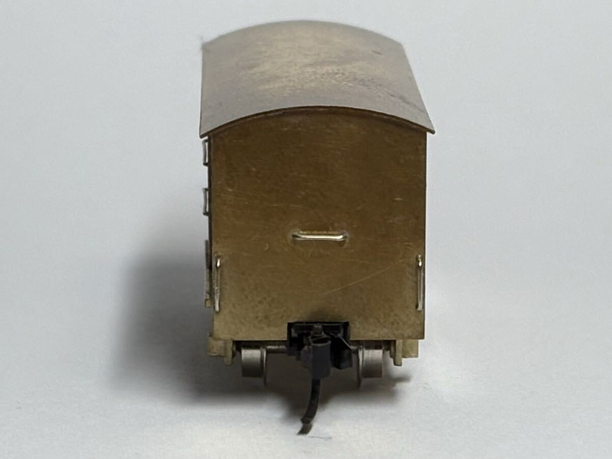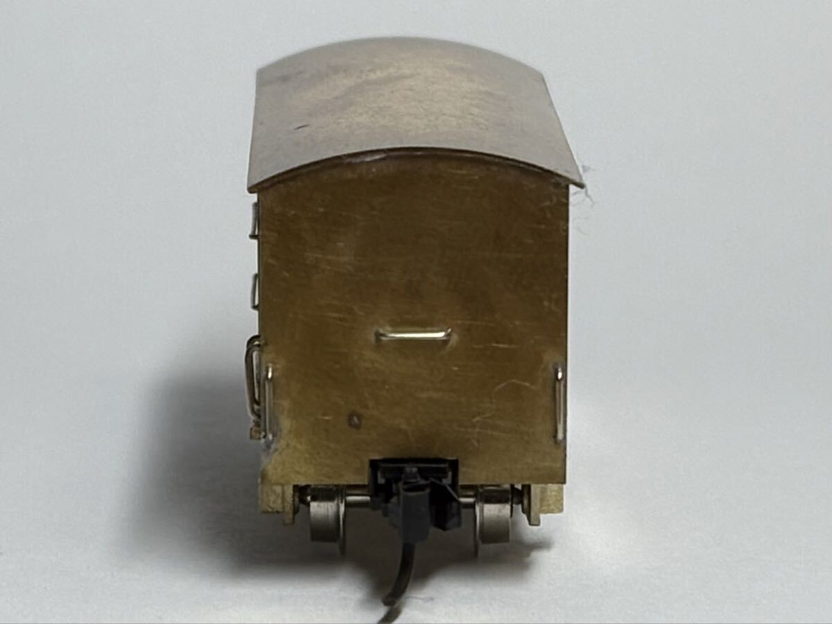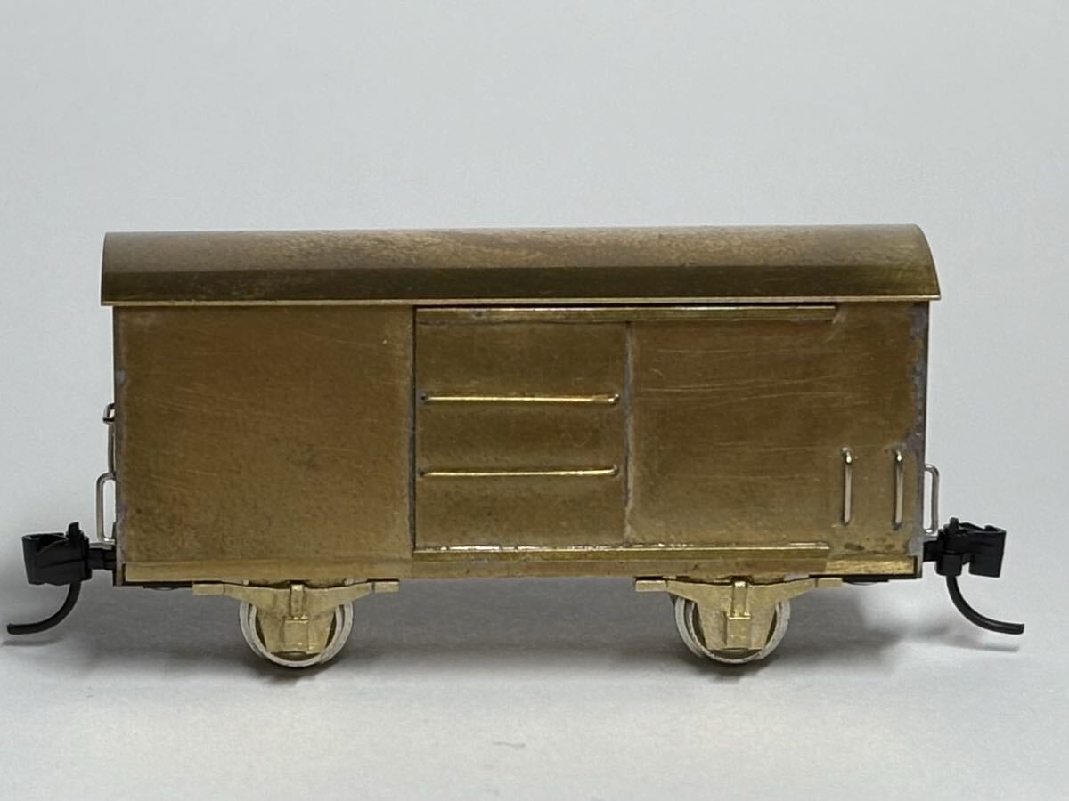 真鍮スクラッチで製作したNゲージの有蓋車です。板から糸のこで切り出してヤスリで仕上げた部品を、ハンダ付けで組み立てました。軸受は特注ロストで、床板にビス留めしてあります。カプラーはマグネマテイックです。