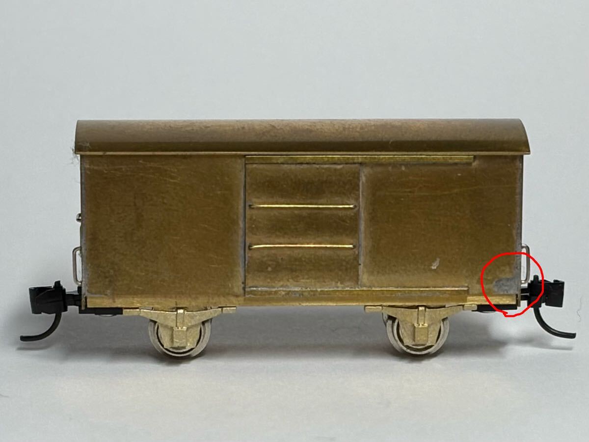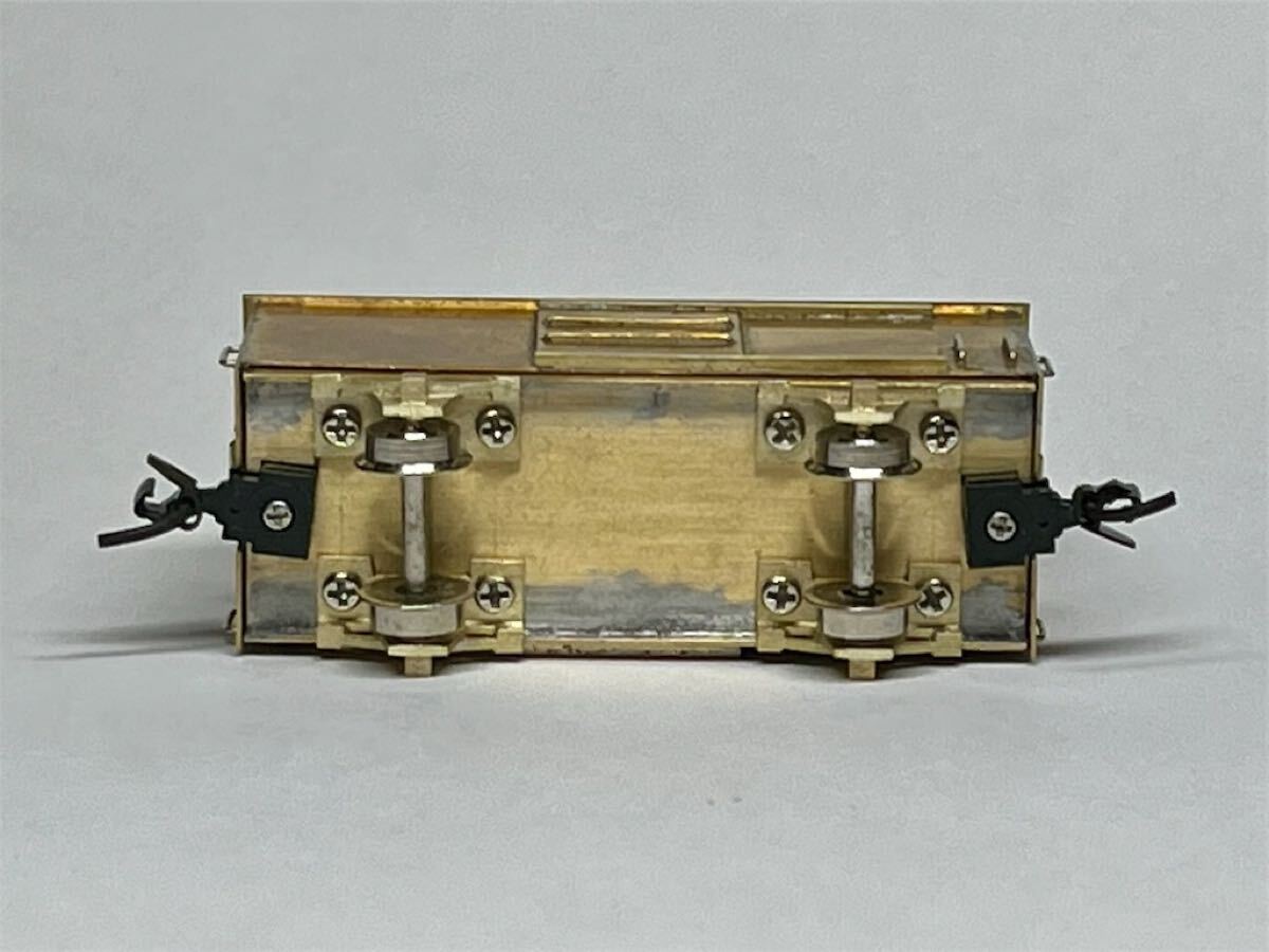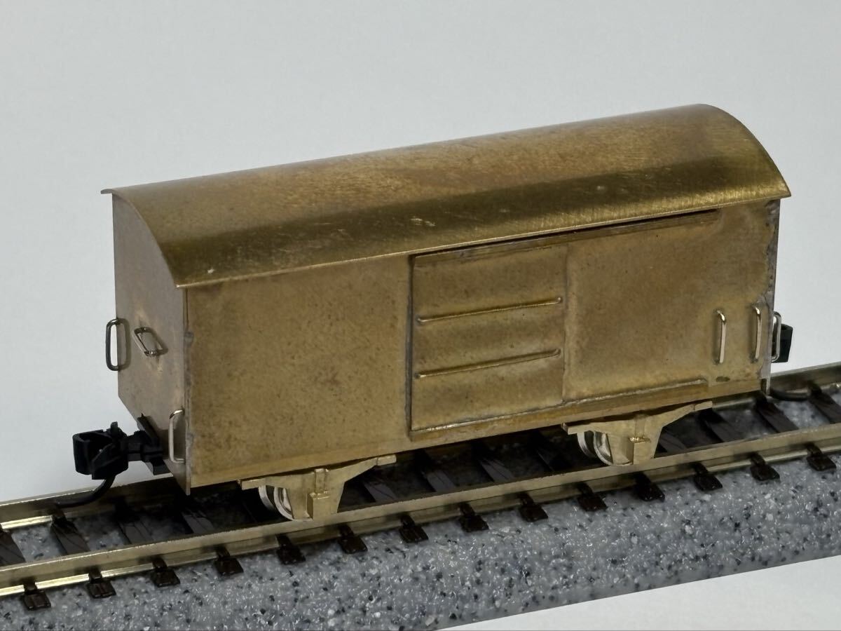 真鍮スクラッチで製作したNゲージの有蓋車です。板から糸のこで切り出してヤスリで仕上げた部品を、ハンダ付けで組み立てました。軸受は特注ロストで、床板にビス留めしてあります。カプラーはマグネマテイックです。